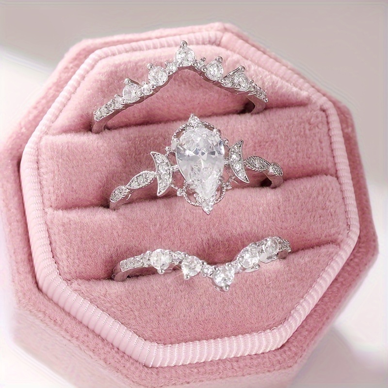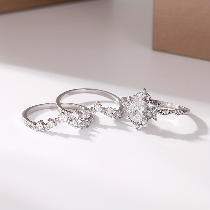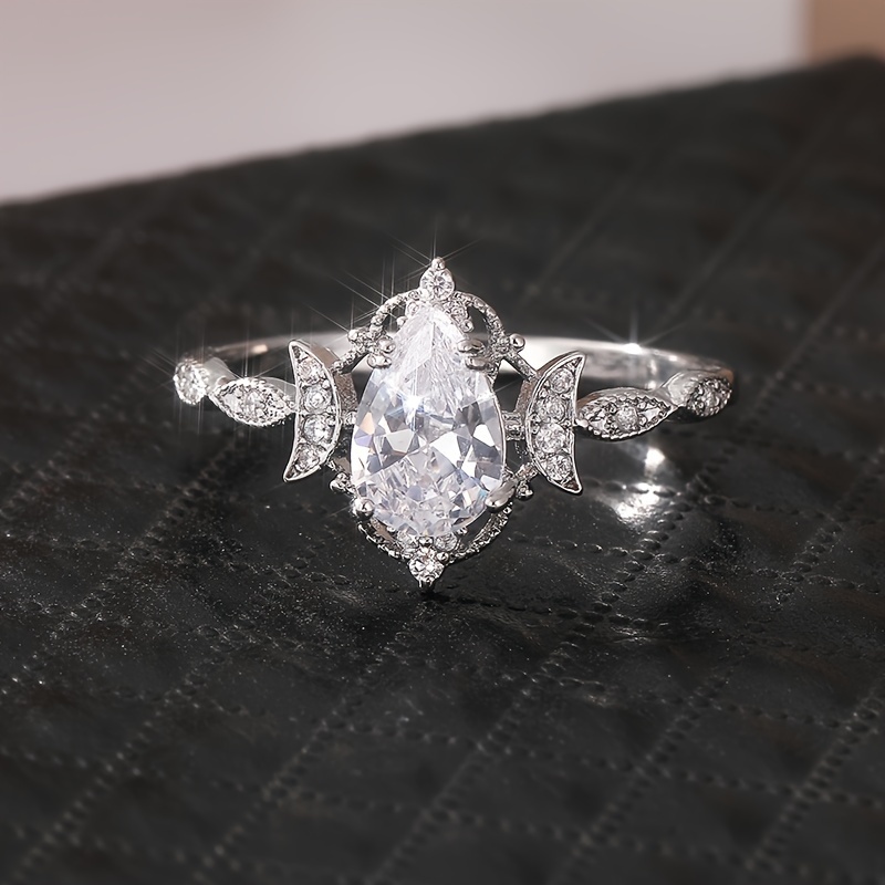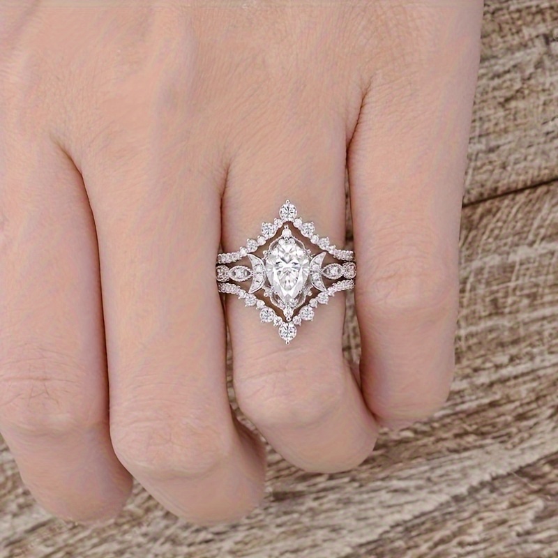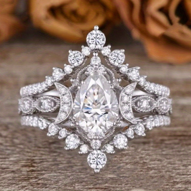 1.2 Carat Pear Shaped Zirconia Crescent Engagement Ring 3 Piece Set, Moon Engagement Ring, Vintage Engagement Ring, Art Deco Gift, Vintage