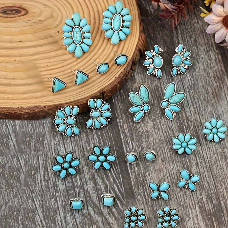 12 pairs of vintage western style set with turquoise stud earrings, silver alloy and iron earrings, geometric triangles, squares and flower shapes