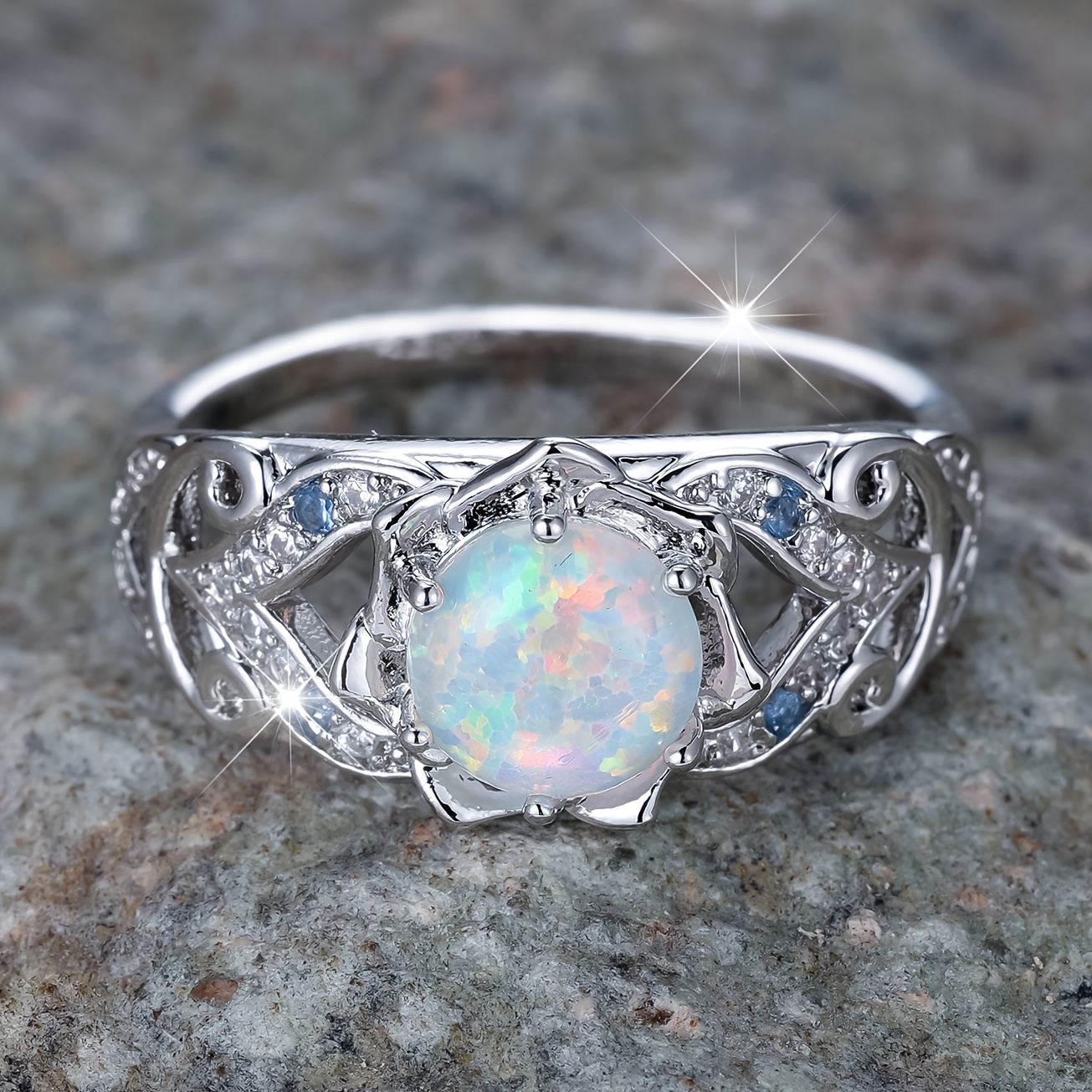 A delicate silver ring with synthetic opal and sapphire trim - perfect for parties and weddings