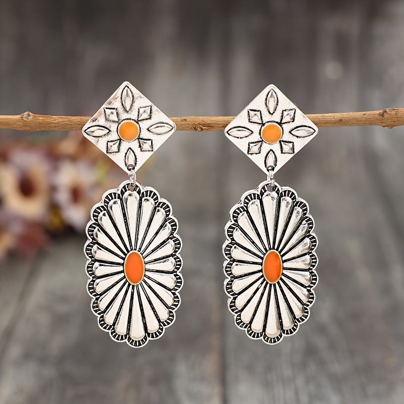 A pair of bohemian vintage floral engraved earrings, alloy pendant with iron studs, bohemian fashion earrings, silver tones with orange accents