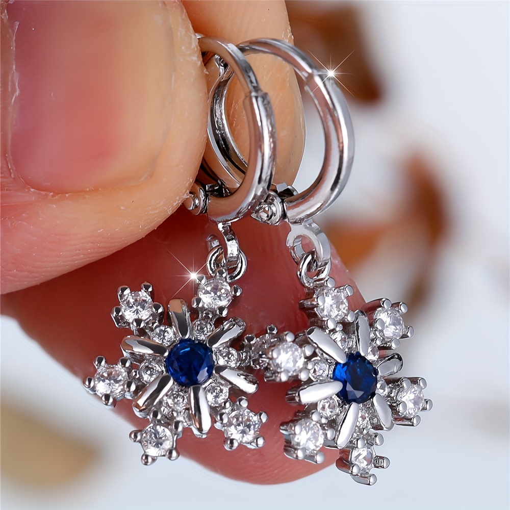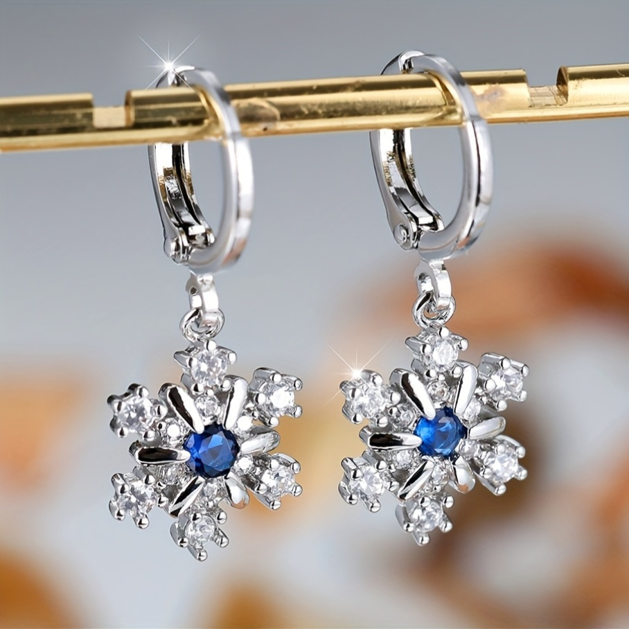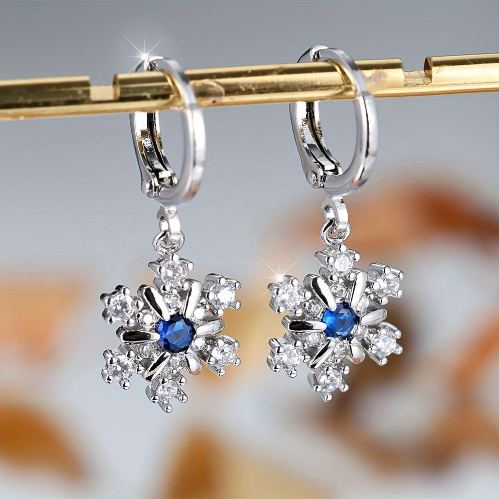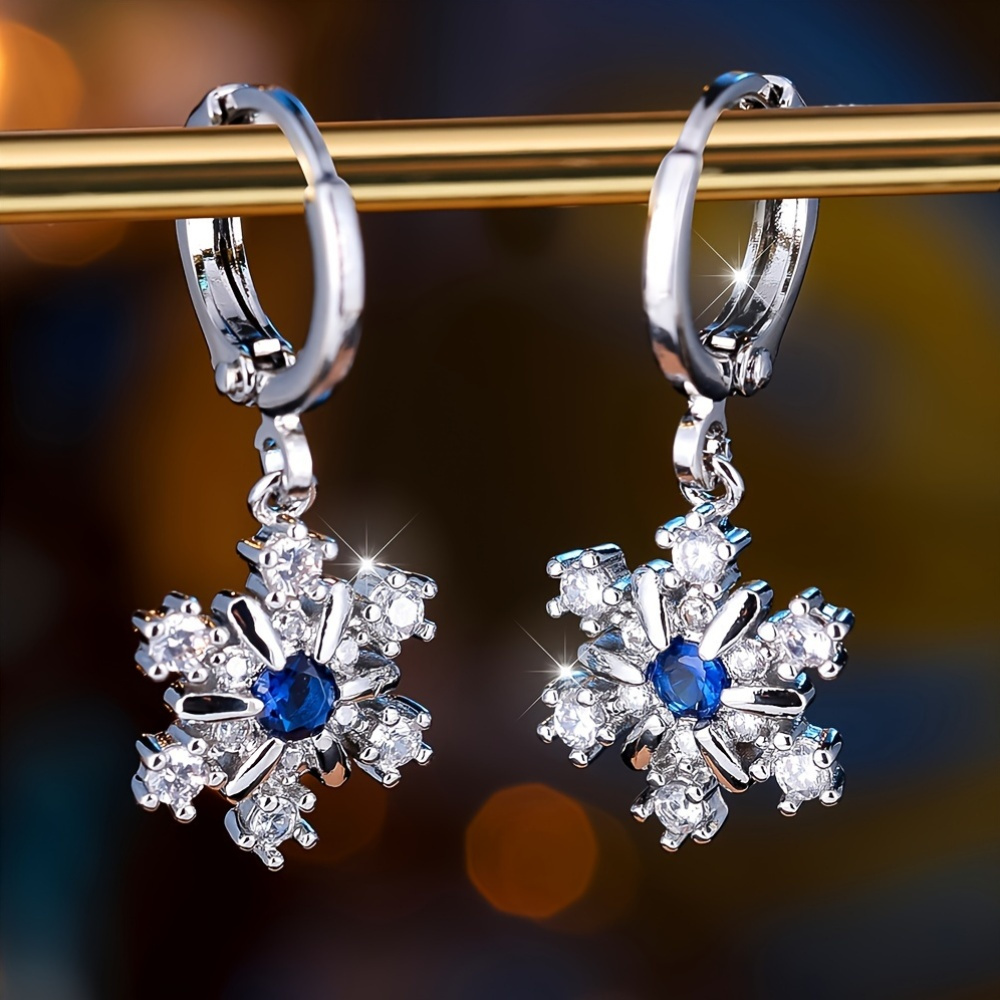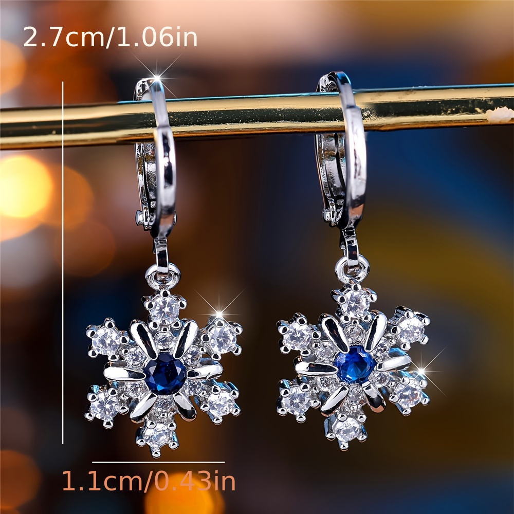 A pair of copper snowflake stud earrings with blue synthetic Zirconia, winter luxury fashion jewelry, suitable for women, cute fringed long stud earrings, suitable for Christmas and Valentine's Day