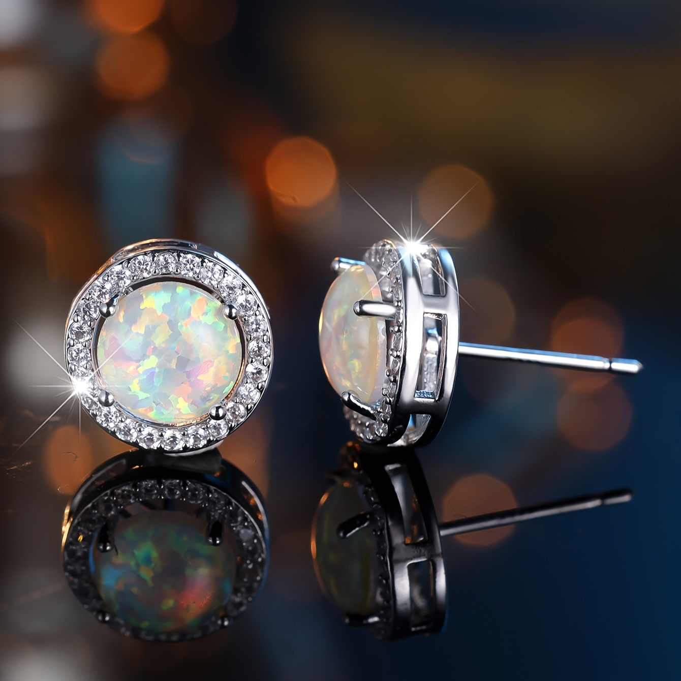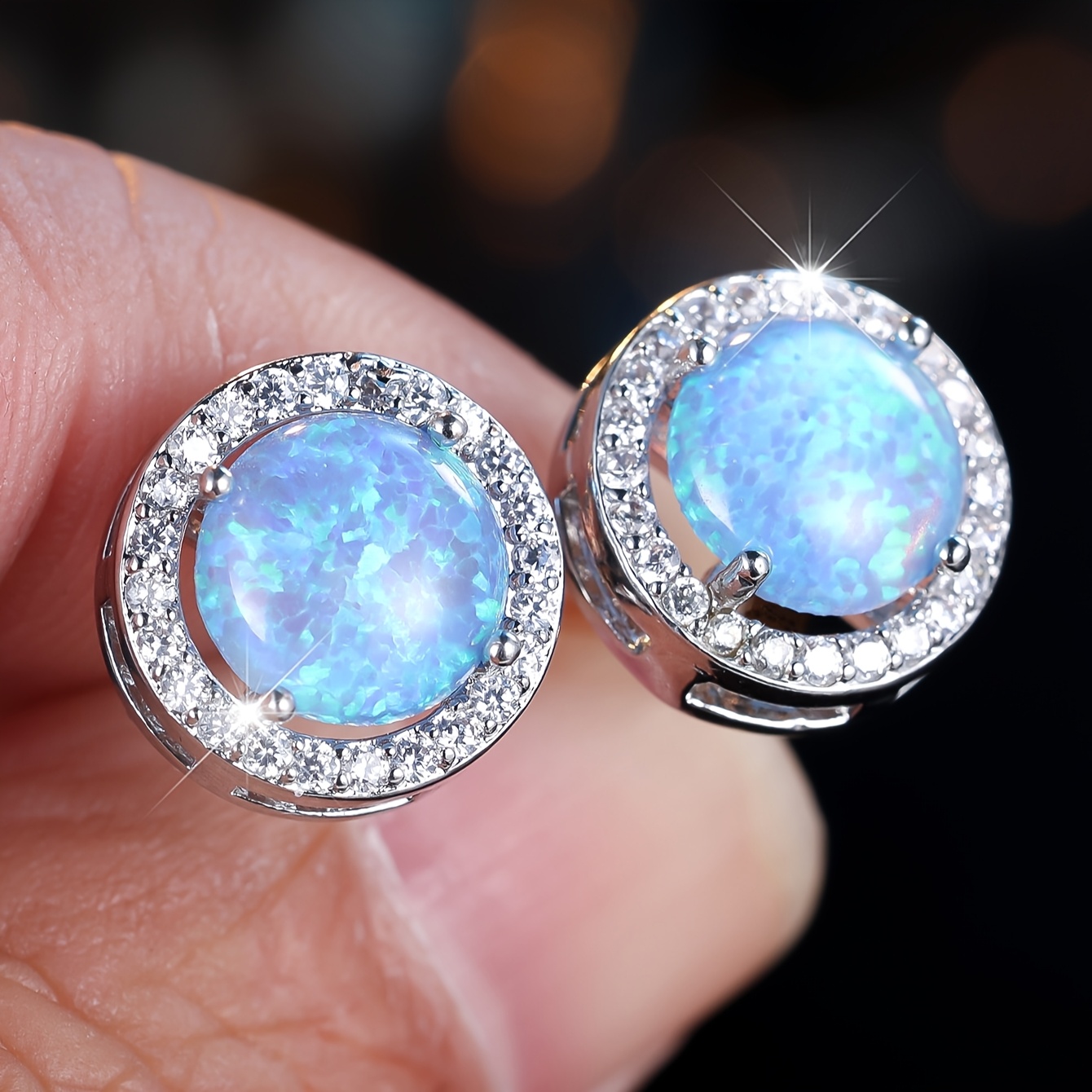 A pair of elegant white and blue opal round earrings with cubic zirconia halo - perfect for weddings, parties and Valentine's Day gifts, party accessories | occasions | zirconia decoration