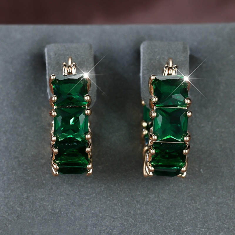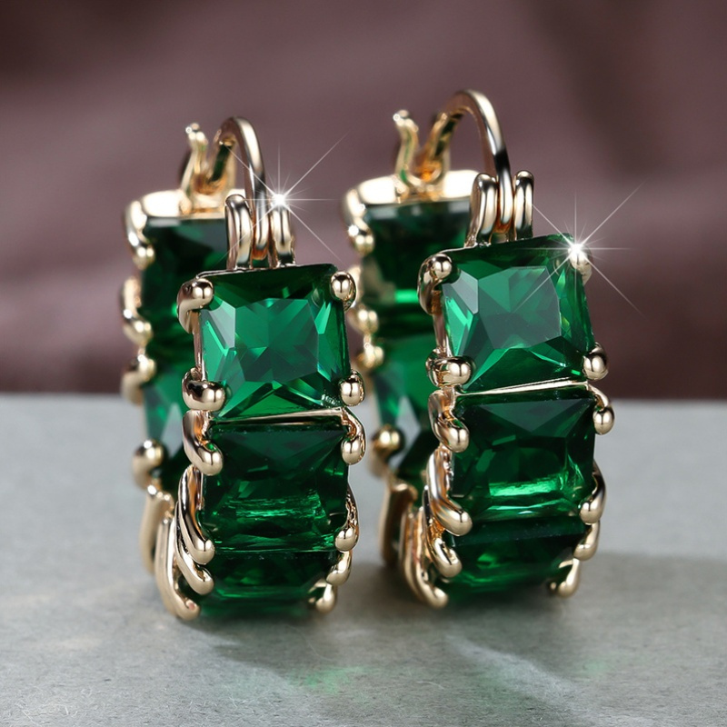A pair of gold square cut green gem drop earrings, princess earrings, a pretend game gift for Valentine's Day
