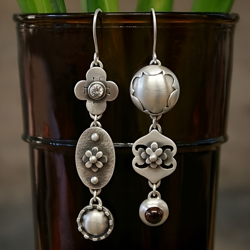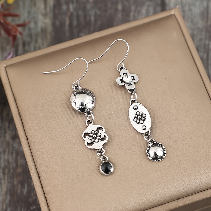 A pair of new retro punk style asymmetrical pattern flower geometric pendant alloy earrings