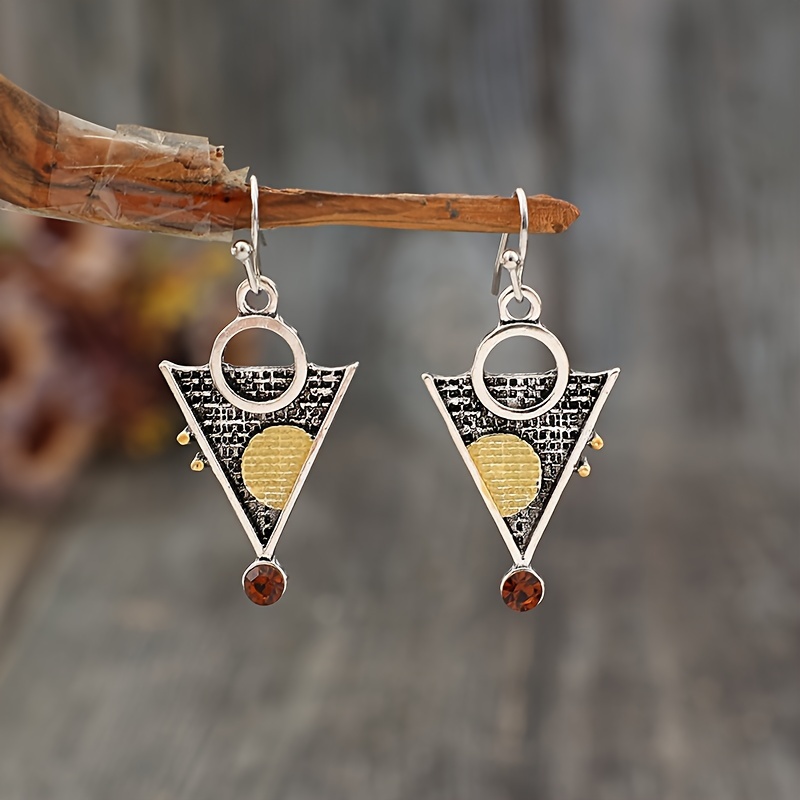 A pair of vintage bohemian triangle sunset alloy earrings with synthetic imitation gemstones, iron ear needles, and fashion jewelry accessories