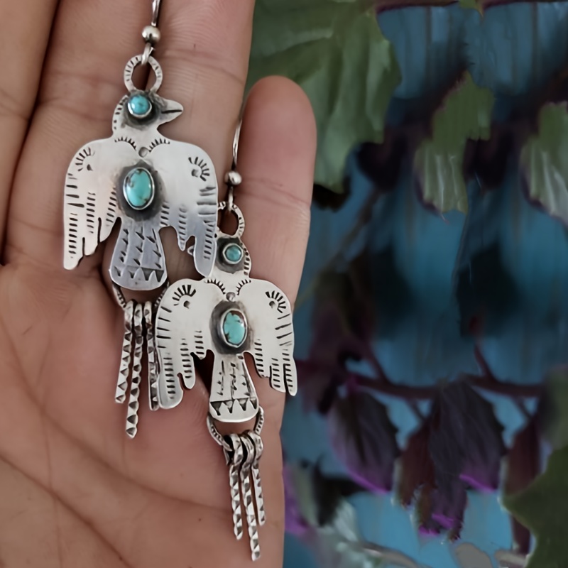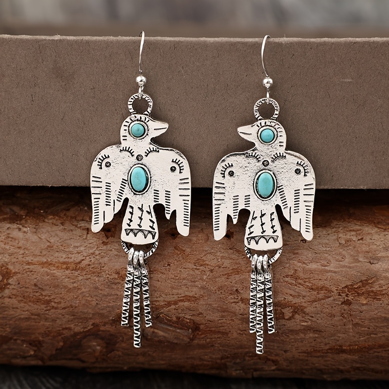 A pair of vintage eagle azure gemstone with ethnic engraving pattern fringed fashion stud earrings, alloy and synthetic crystal, iron stud earrings, silver tone