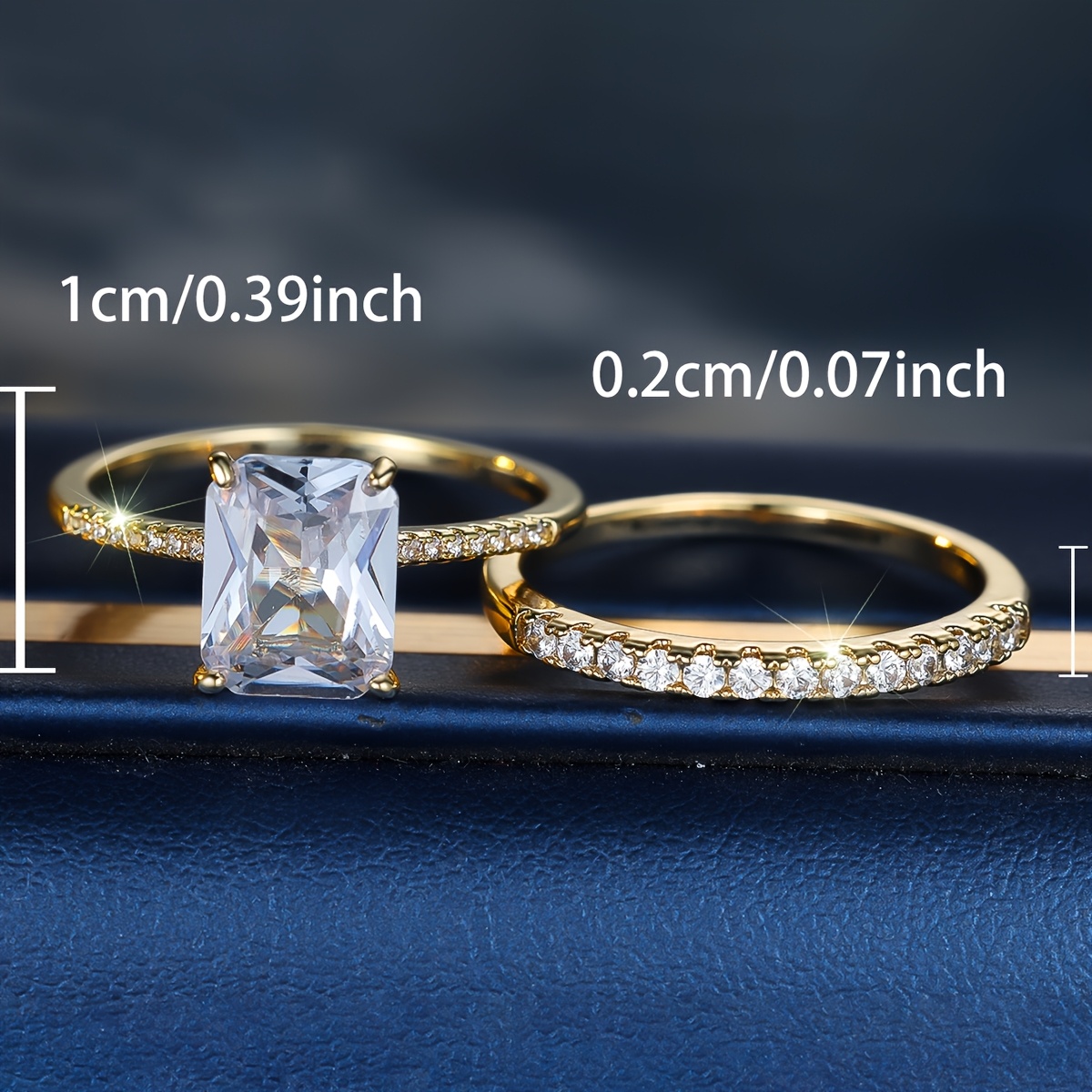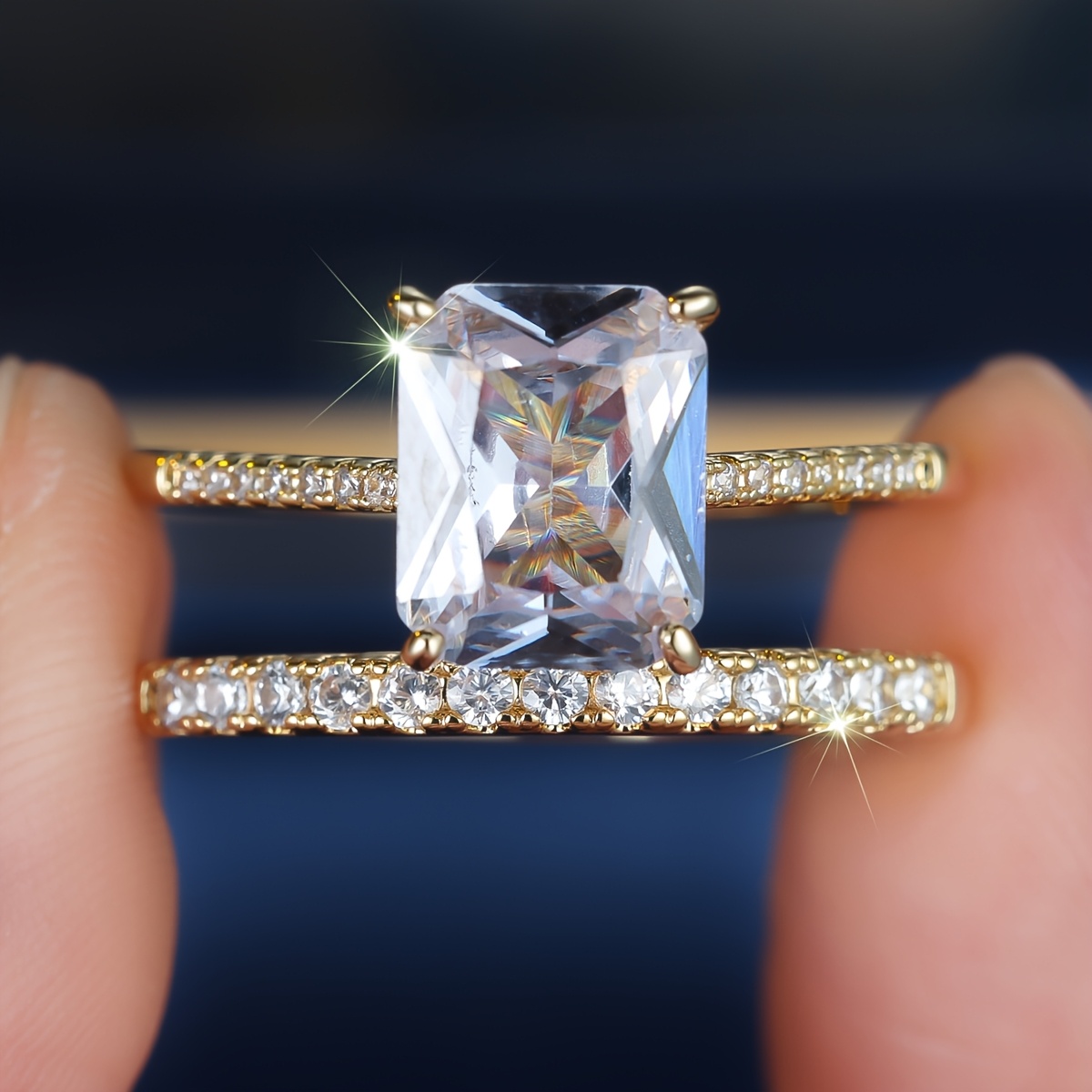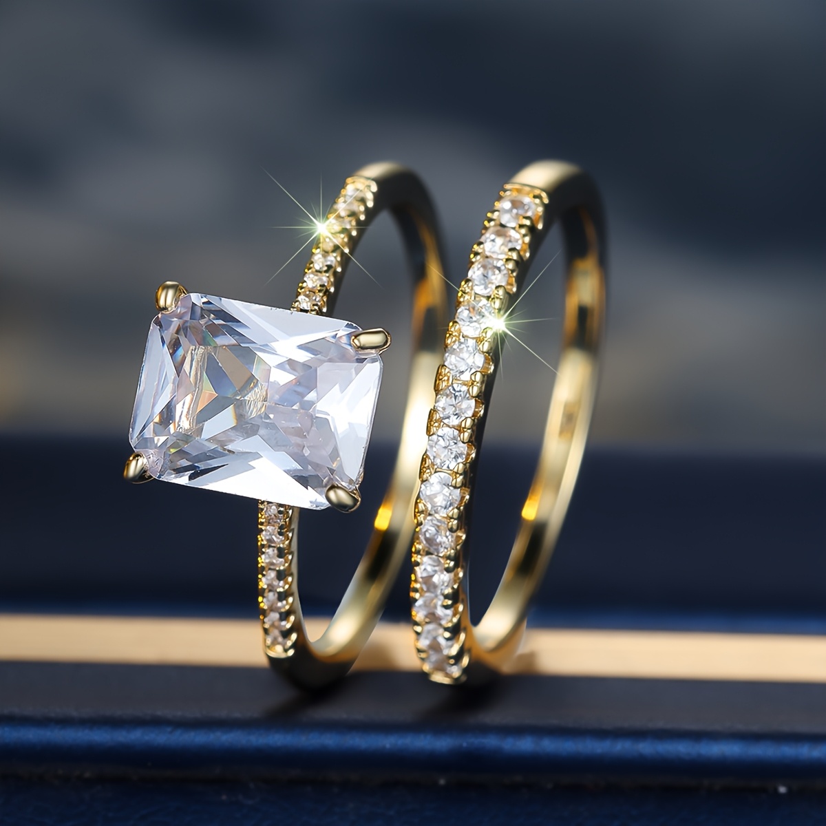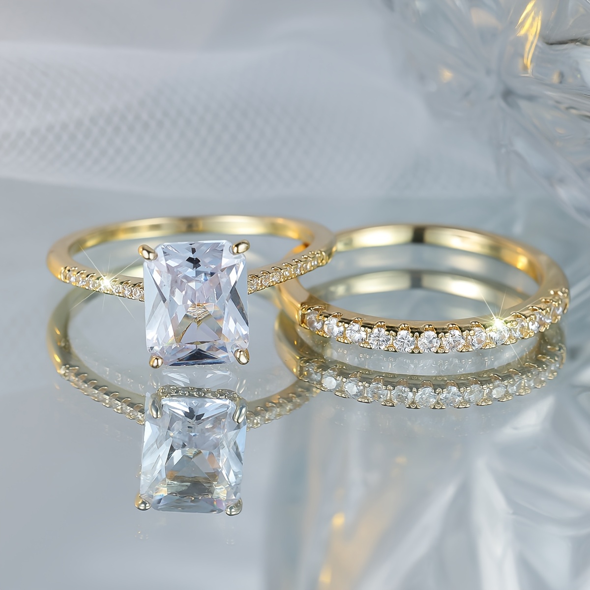 A set of square white Zirconia rings, a two-piece Women's fashion set, and jewelry suitable for holiday parties.