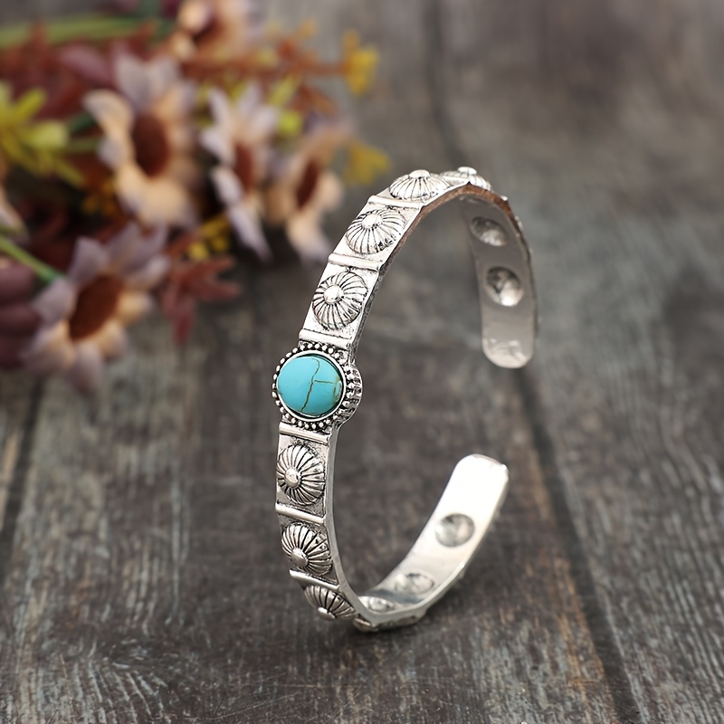 A vintage bohemian turquoise inlaid bracelet, alloy open bracelet, engraved floral design, fashion jewelry accessories
