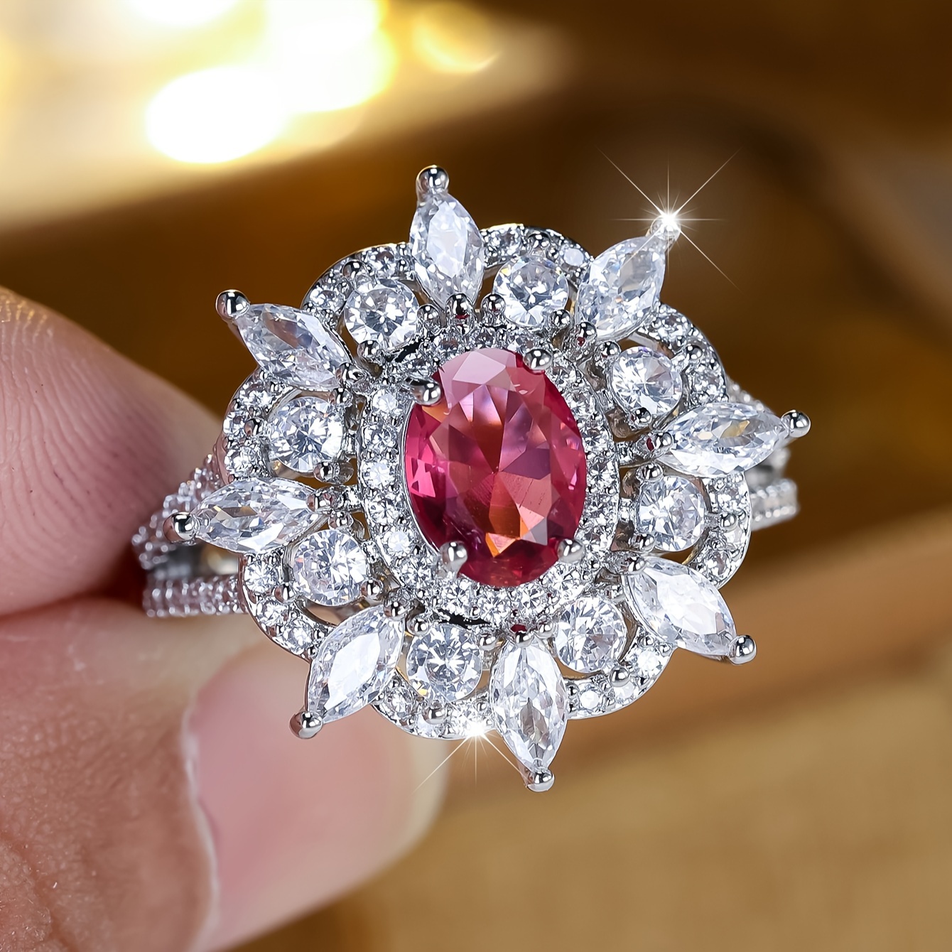 An elegant bohemian style engagement ring, copper with synthetic cubic zirconia, oval pink halo, full band of white water droplets, luxurious wedding, party, lady's birthday gifts