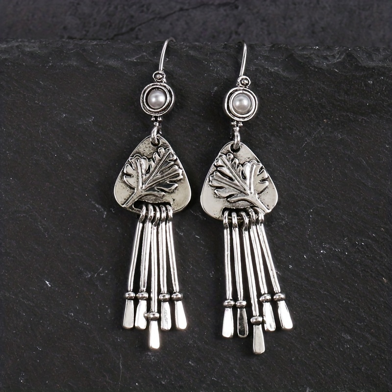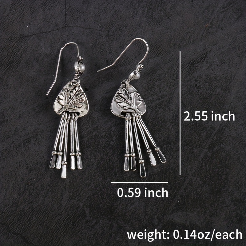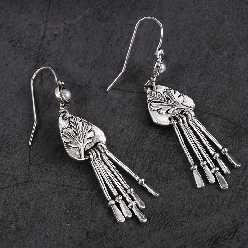 Antique Silver Pendant Earrings, Ladies Creative Bohemian Carved Leaves Cocktail Party Antique Earrings Jewelry