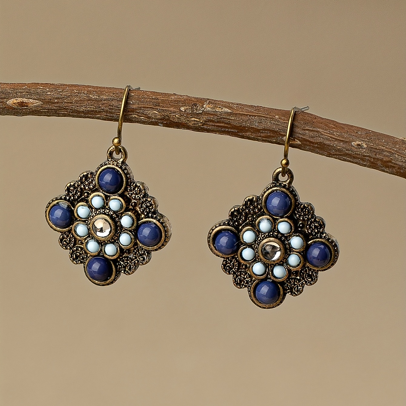 Blue patterned square pendant earrings