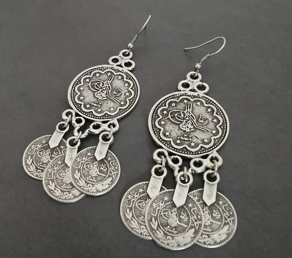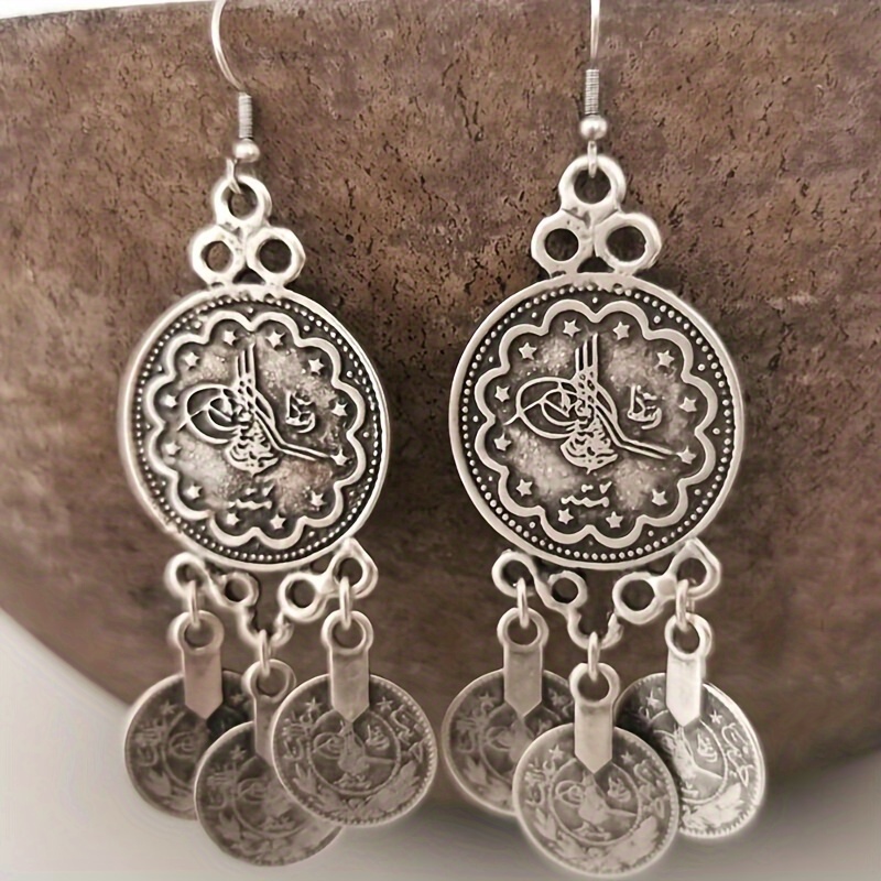 Bohemian Retro Style Alloy Earrings, Stylish Retro Round Hoop with Three Coins Pendant, Bohemian Stylish Ladies Pendant Earrings