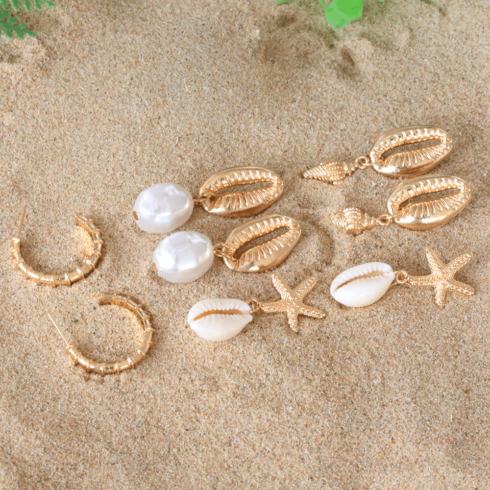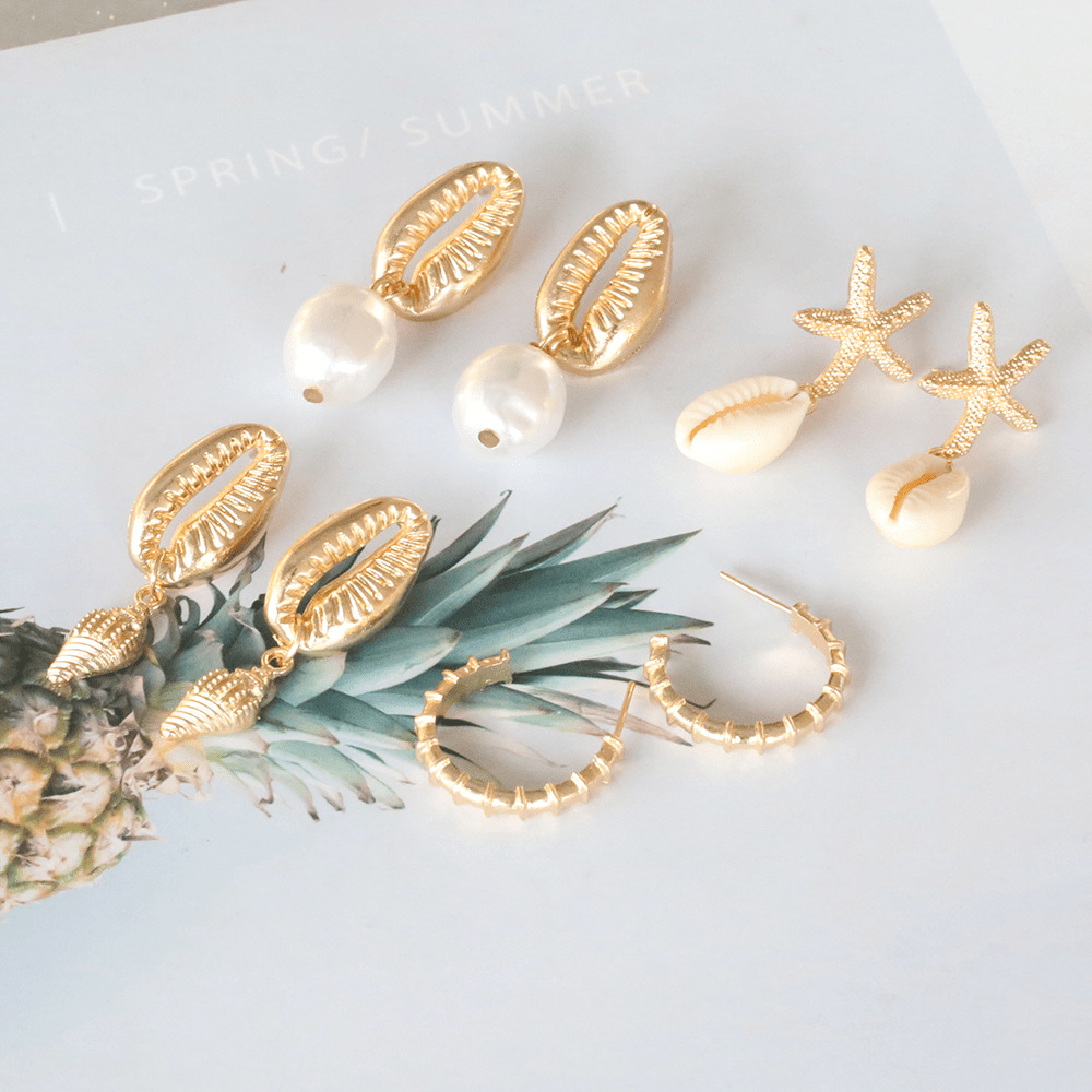 Bohemian Shell Irregular Pearl Conch Starfish Stud Earrings Pendant 4 Pairs Set