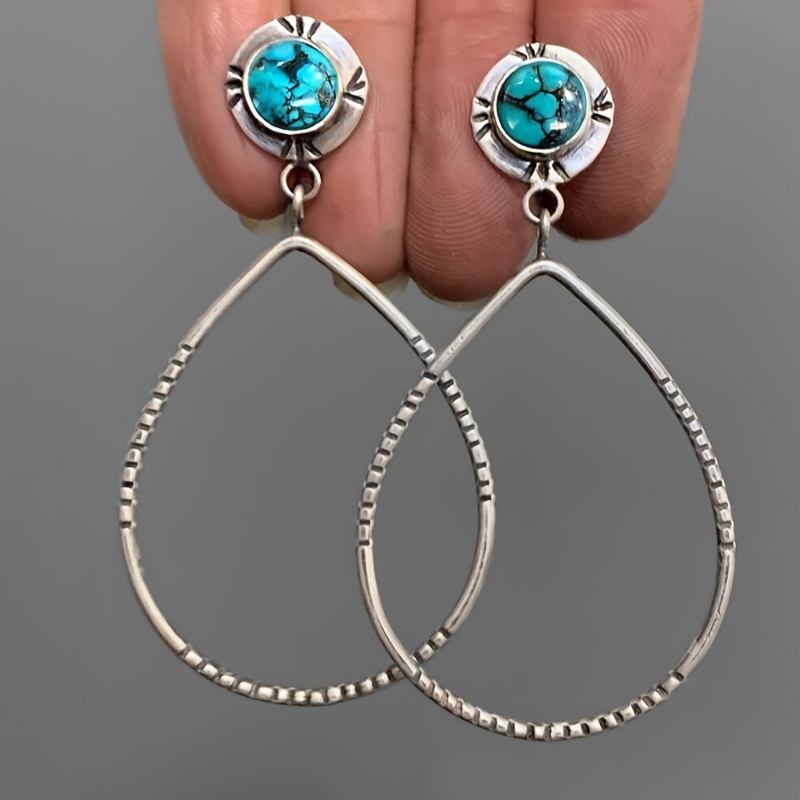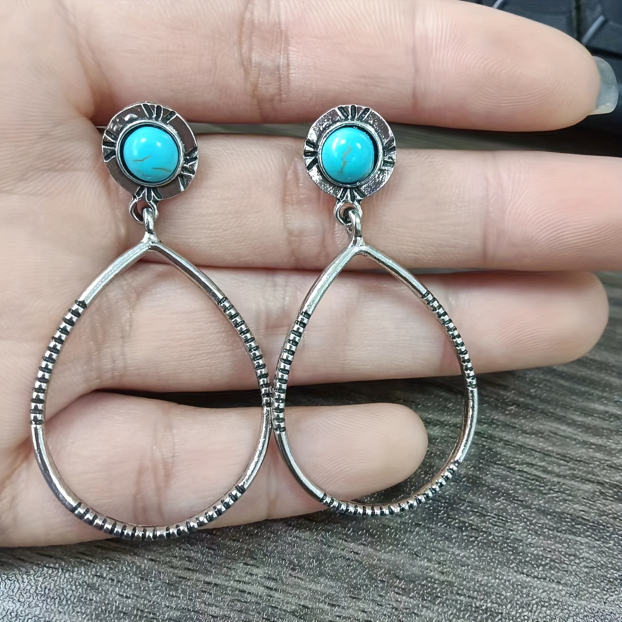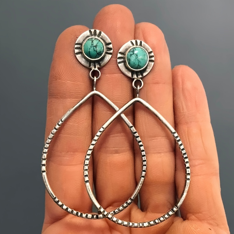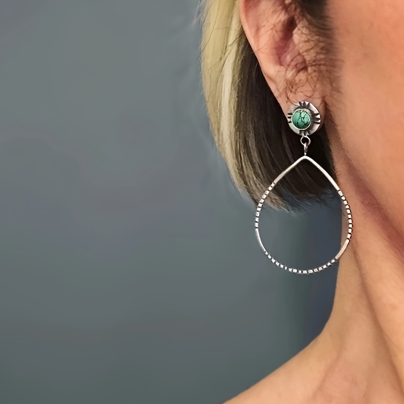 Bohemian style retro earrings, exaggerated artificial geometric teardrop hollow accessory design, turquoise rivets, fashion jewelry
