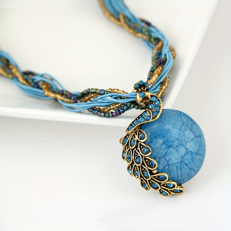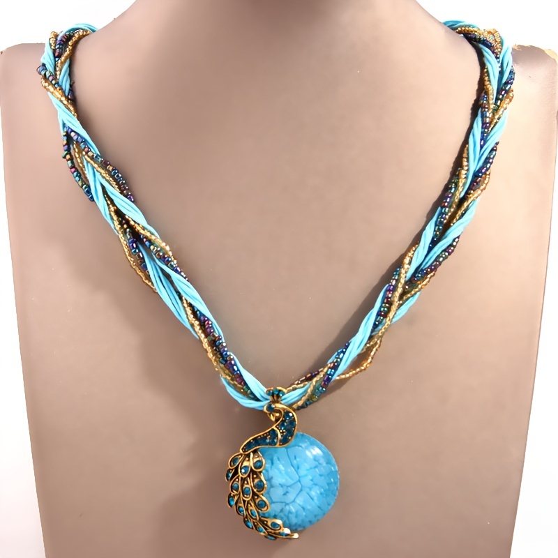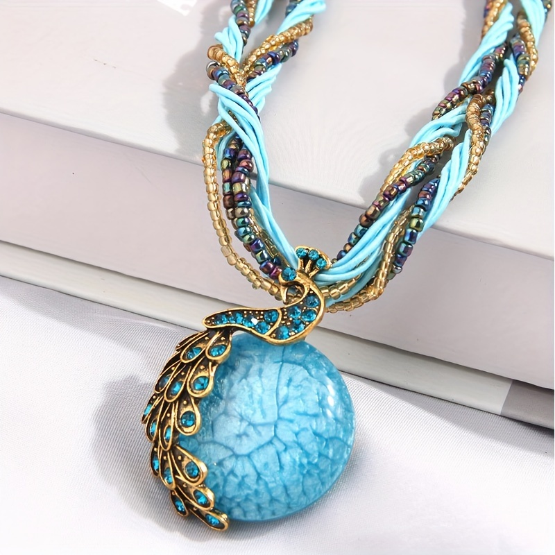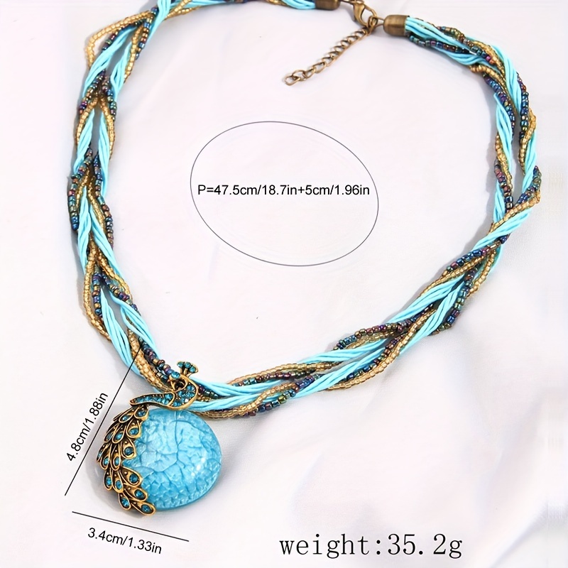 Bohemian style retro socialite peacock blue rice bead multi-layer short necklace imitation stone pendant necklace Women's jewelry gift