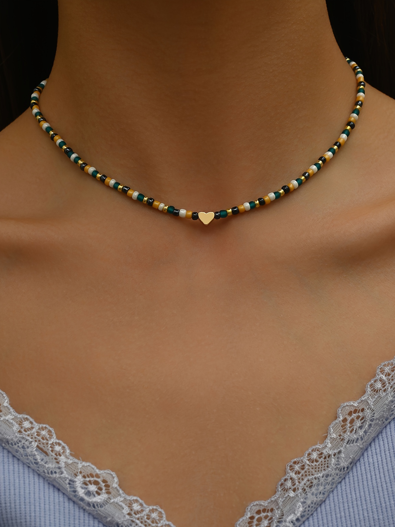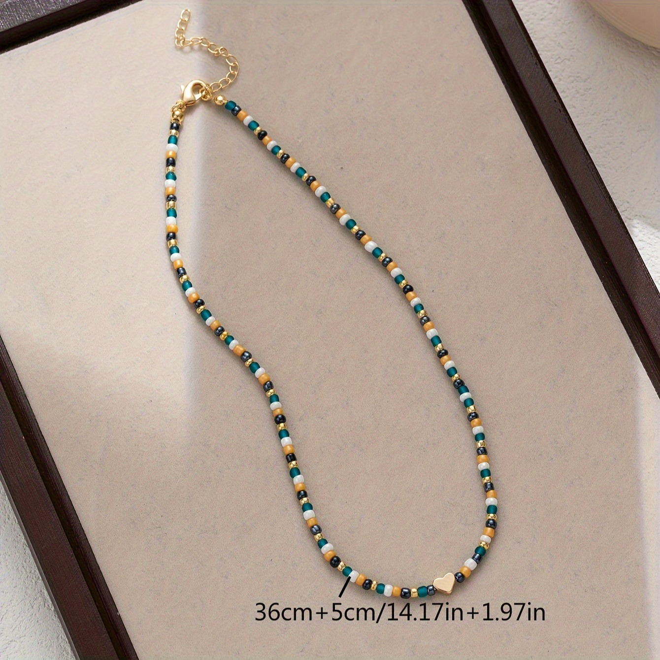 Bohemian Tribal Beaded Necklace with Heart Charm - Beach Vacation Bead Necklace, Everyday Wear Jewelry Accessories - No Plating, Versatile in All Seasons
