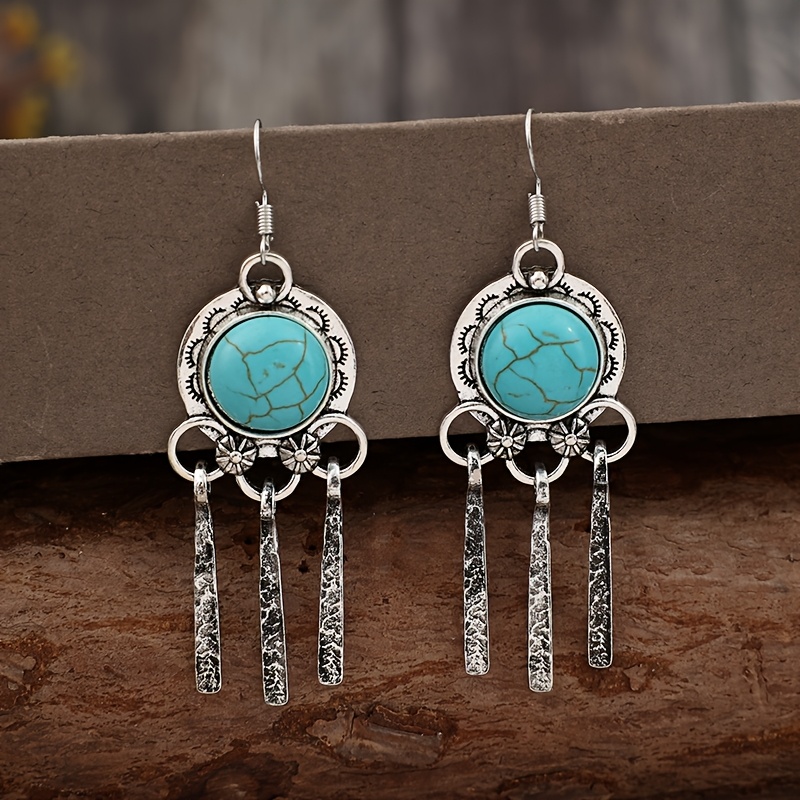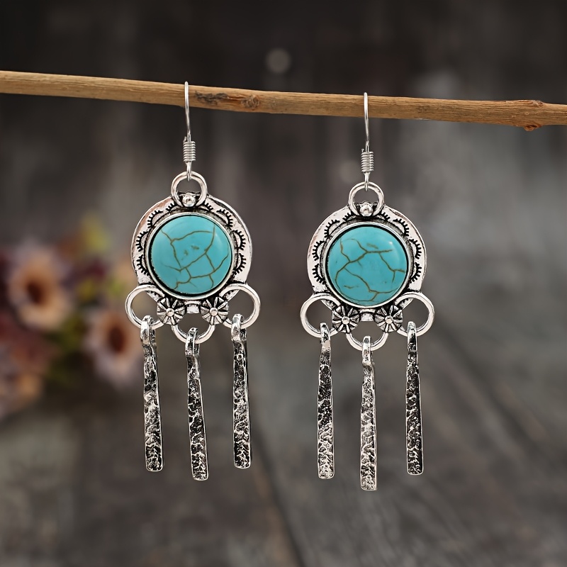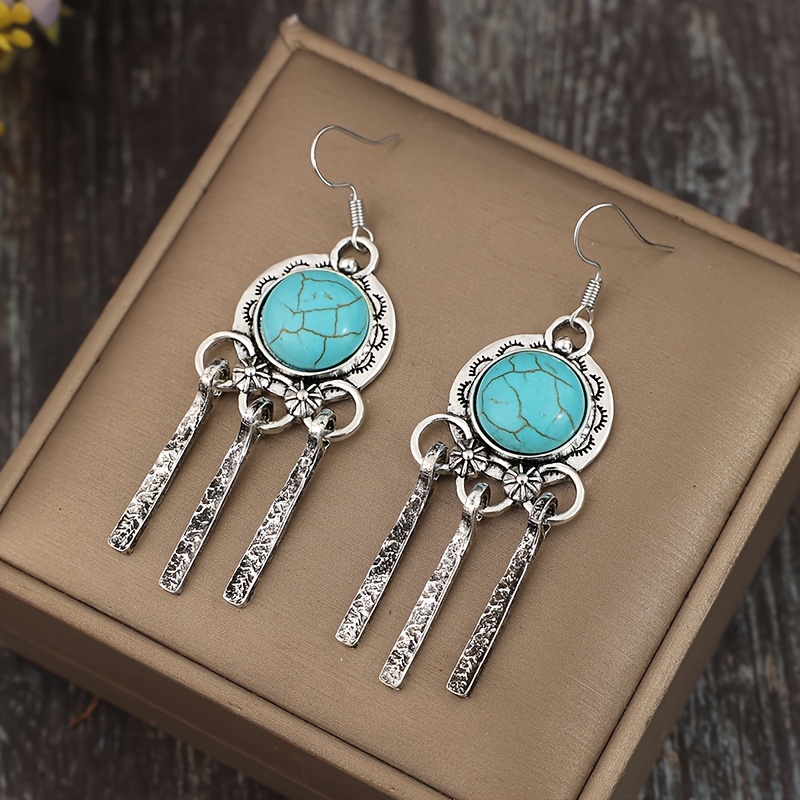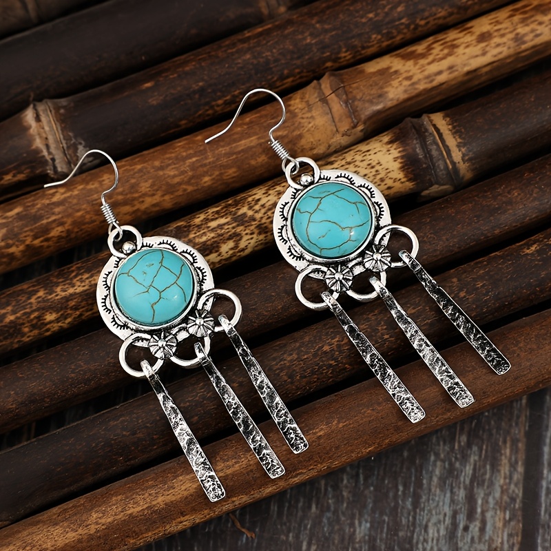 Bohemian Turquoise Fringed Hanging Earrings - Vintage Alloy with Faux Stone Accessories, Silver Finish