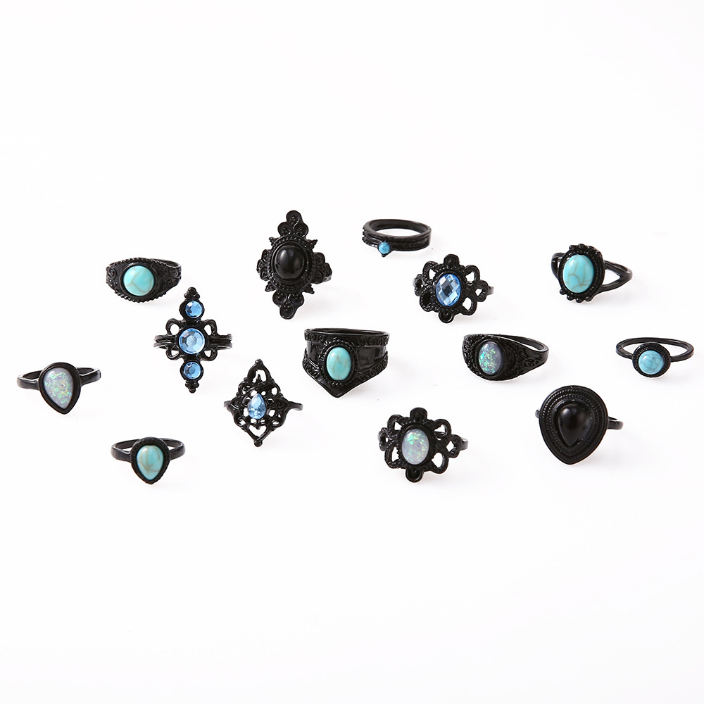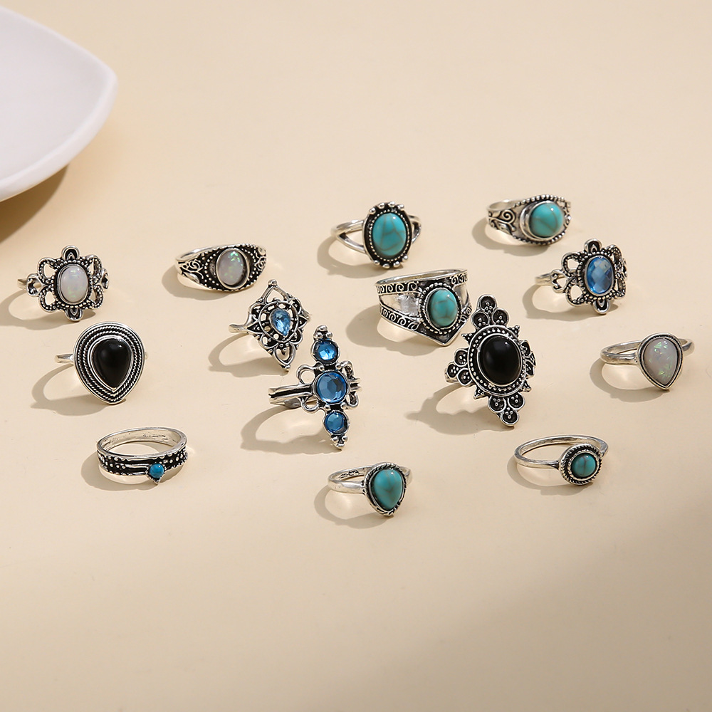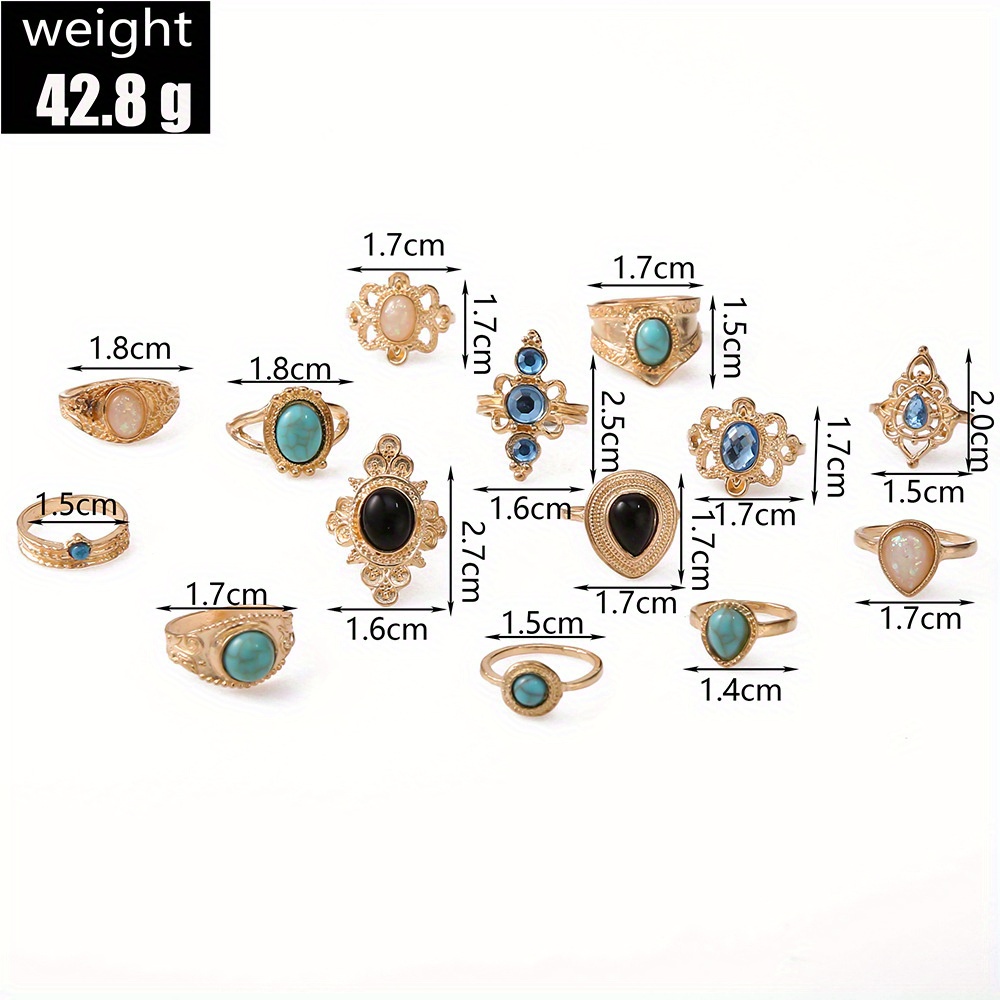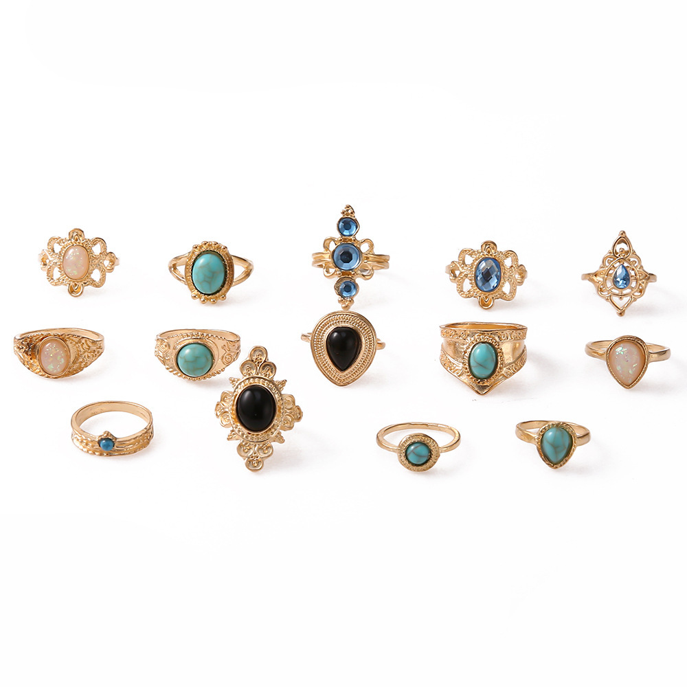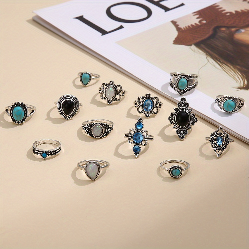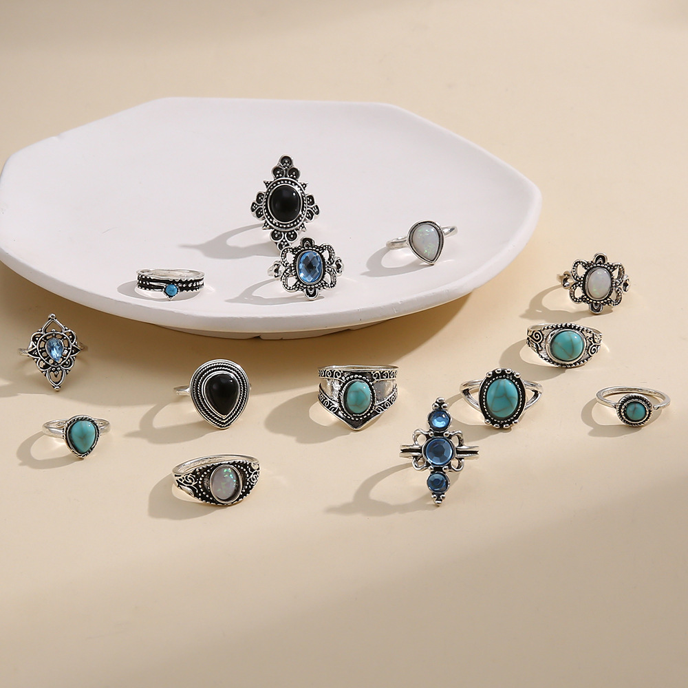Cat's Eye Ethnic Turquoise Ring with Diamond Sapphire Ring with Minor Rhinestone 14-piece Ring Set