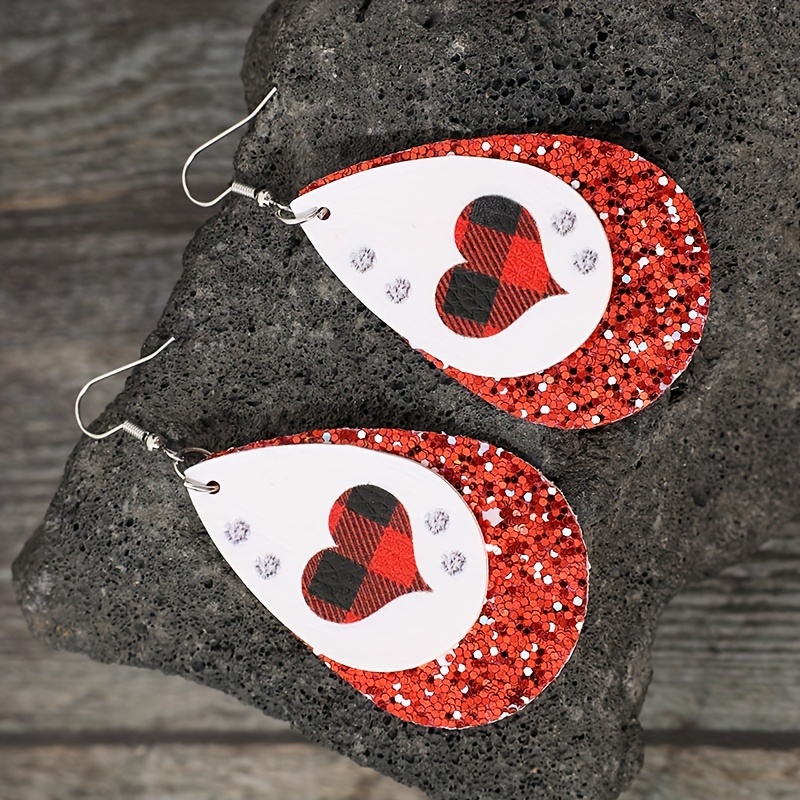 Drop-shaped heart-shaped printed gold sparkling pendant earrings retro simple style PU leather jewelry lover's Valentine's Day gift