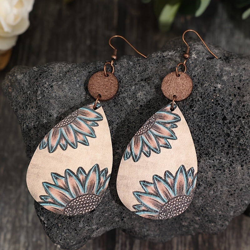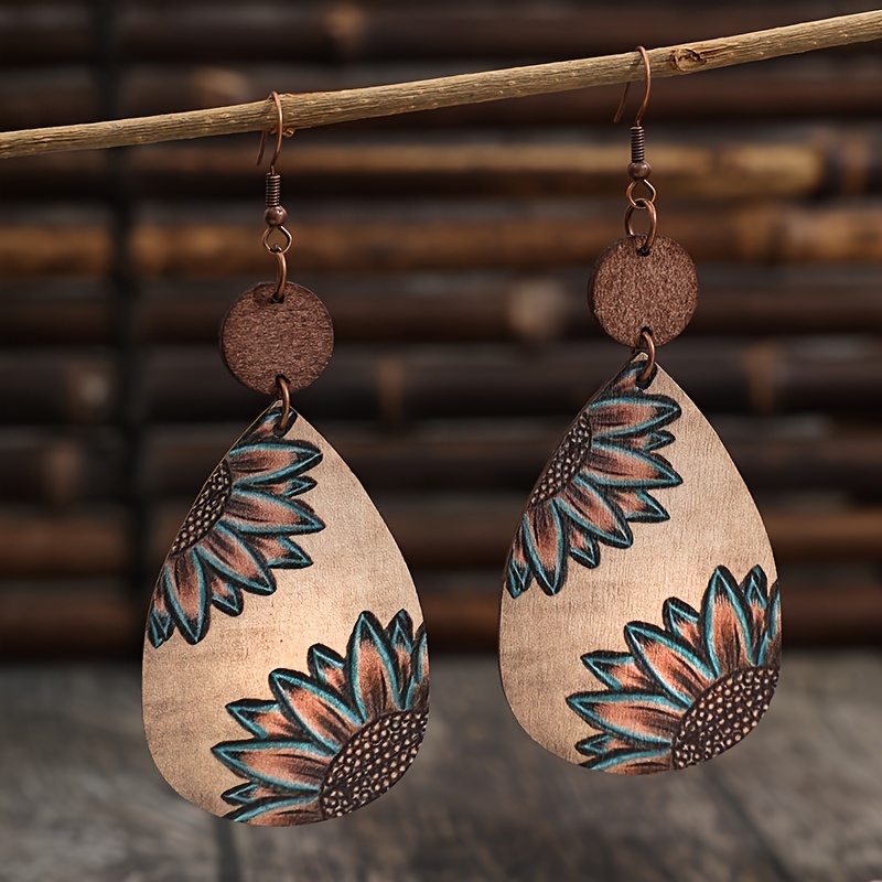 Droplet Sunflower Print Pendant Earrings Vintage Bohemian Wooden Jewelry Fashion Women's Earrings