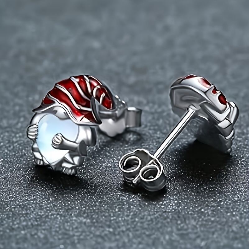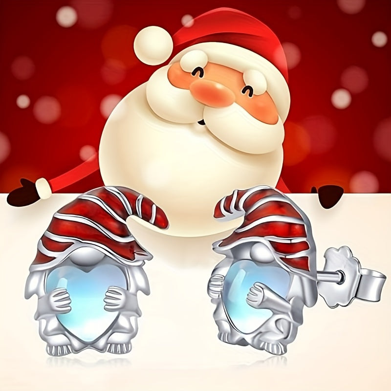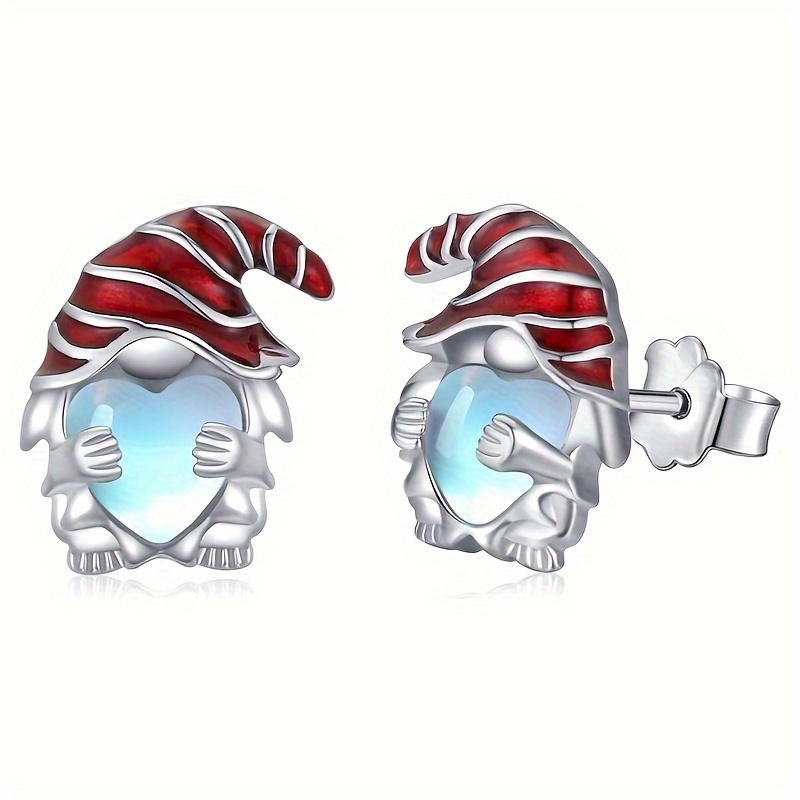 Elegant and cute moonstone heart stud earrings with red Christmas hat - nickel-free copper for everyday wear or holiday parties