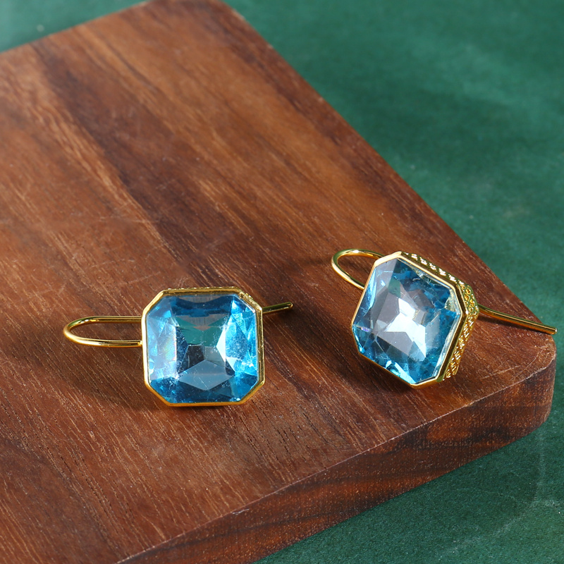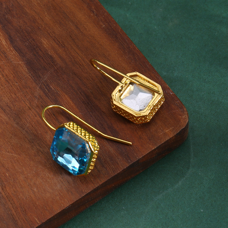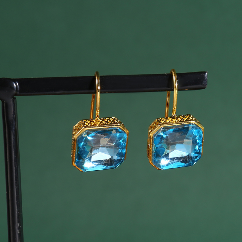 Elegant and luxurious 14K gold-plated zinc alloy square pendant earrings with synthetic sky blue Zirconia, Women's fashion jewelry