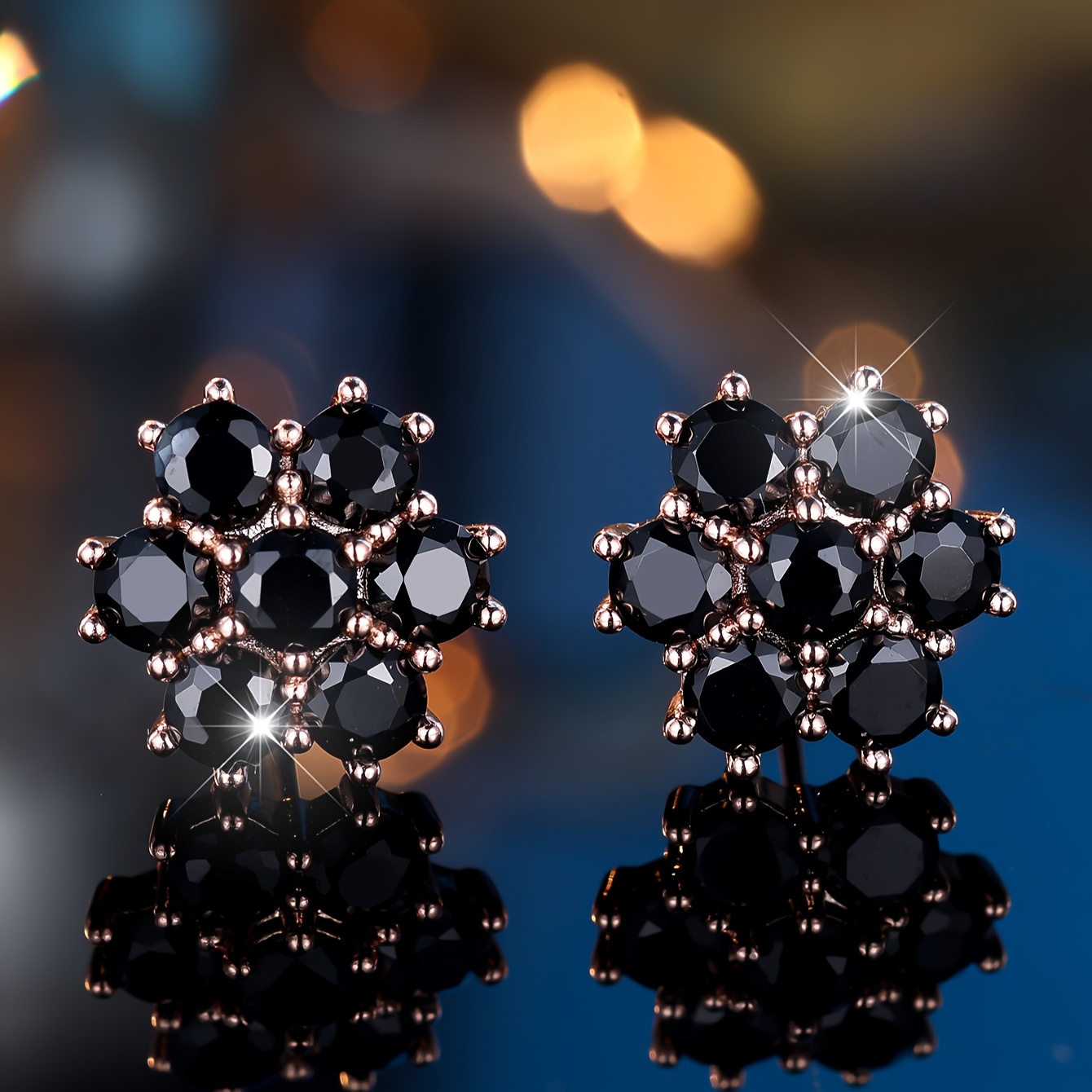 Elegant bohemian black flower-shaped synthetic square crystal diamond stud earrings, copper, women's style with rose gold plating, suitable for weddings, banquets, Valentine's Day - year round jewelry