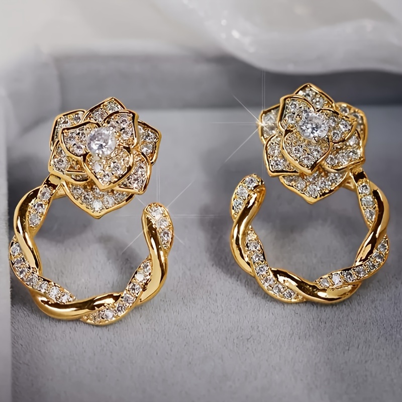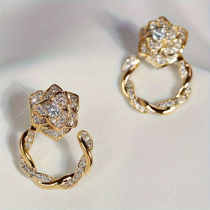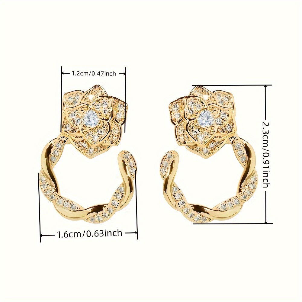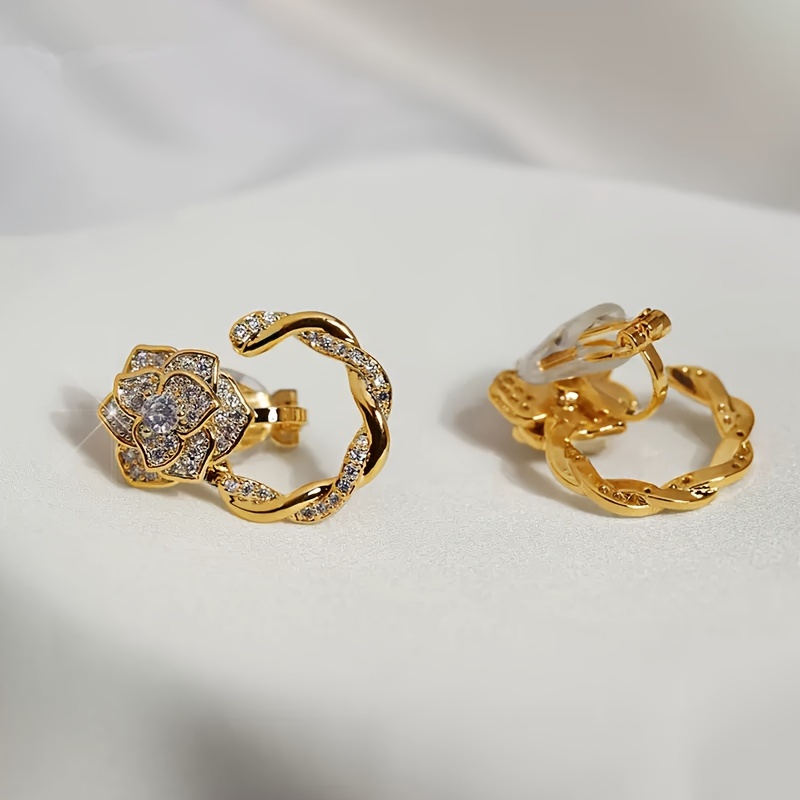 Elegant gold floral clip earrings with shiny square zircon - luxury, nickel-free copper for weddings, engagements and parties, lovely earrings