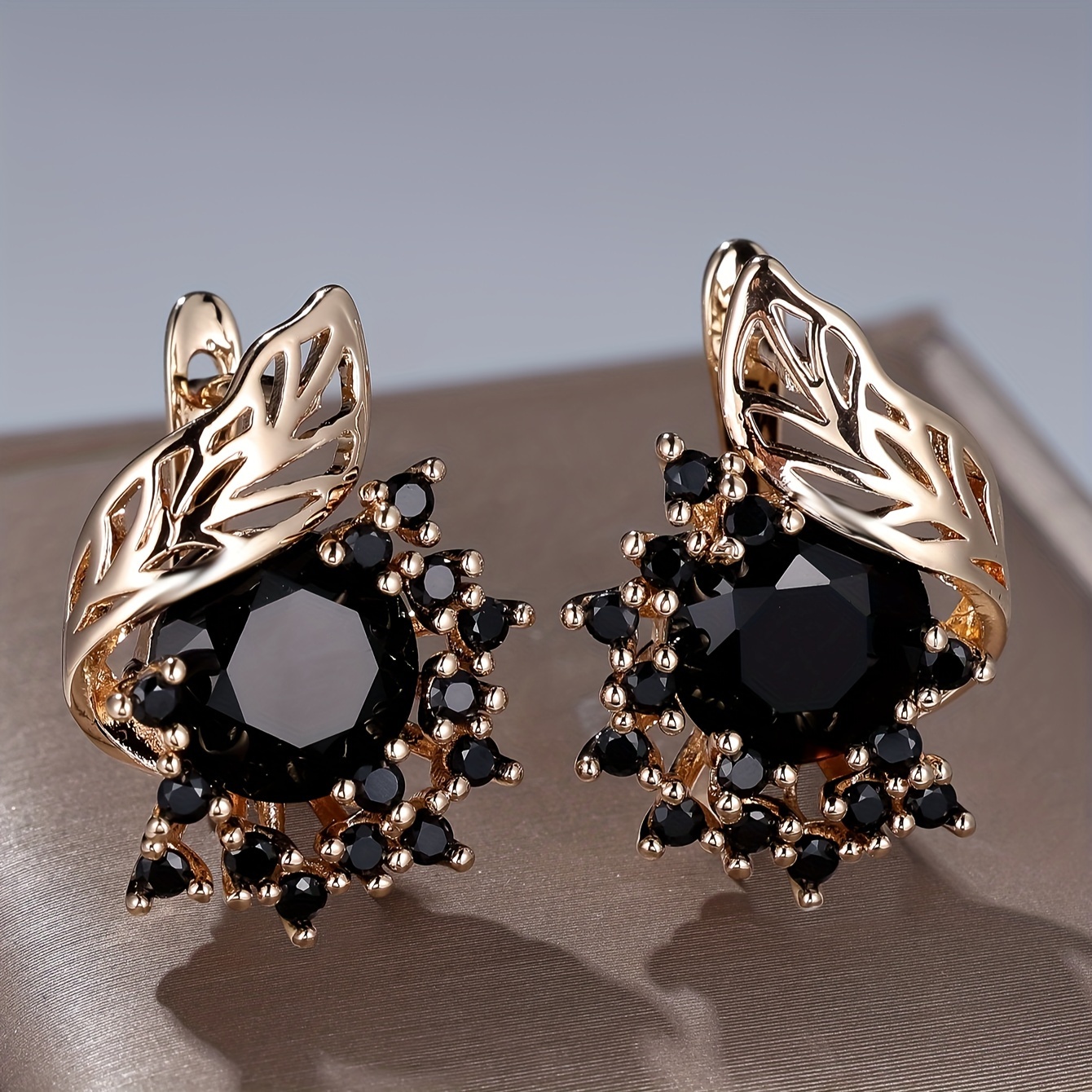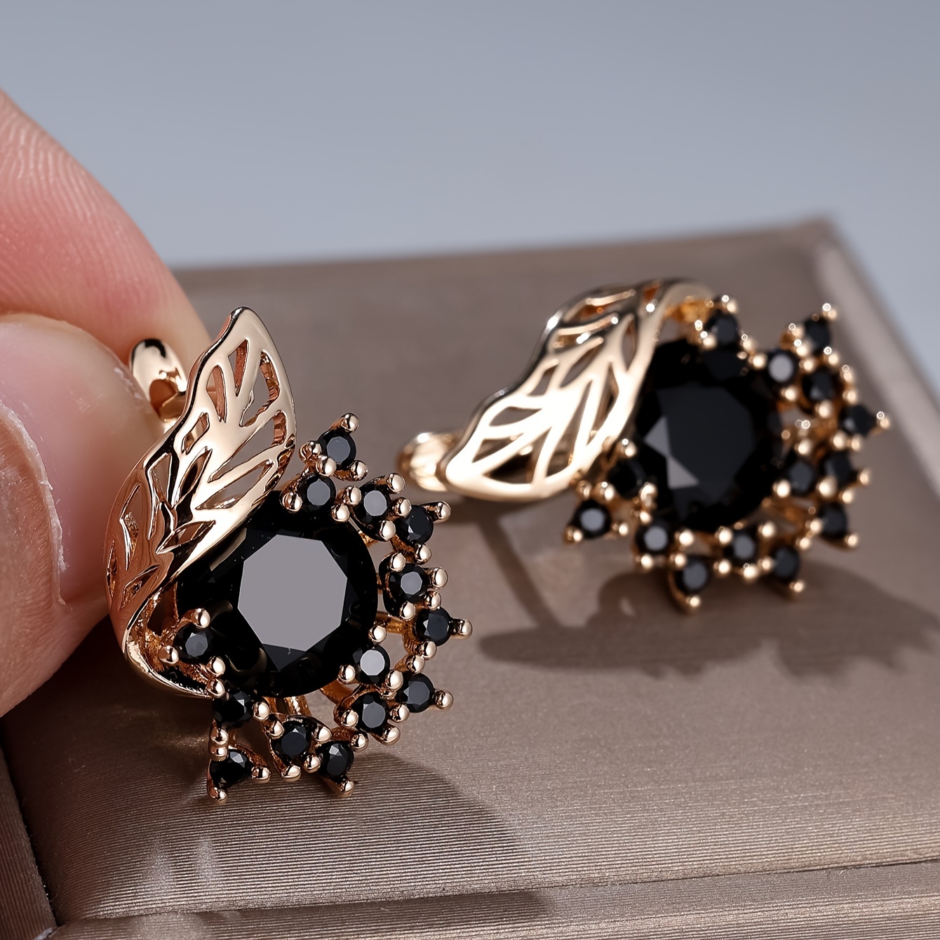 Elegant gold floral pendant earrings, round black Zirconia, copper wedding accessories, perfect for all seasons, winter and New Year
