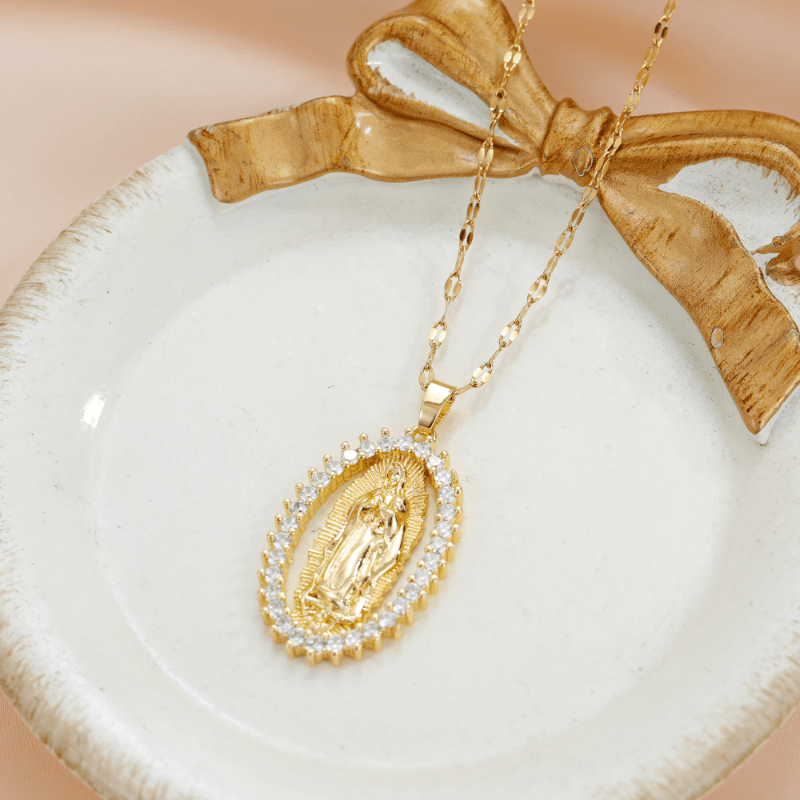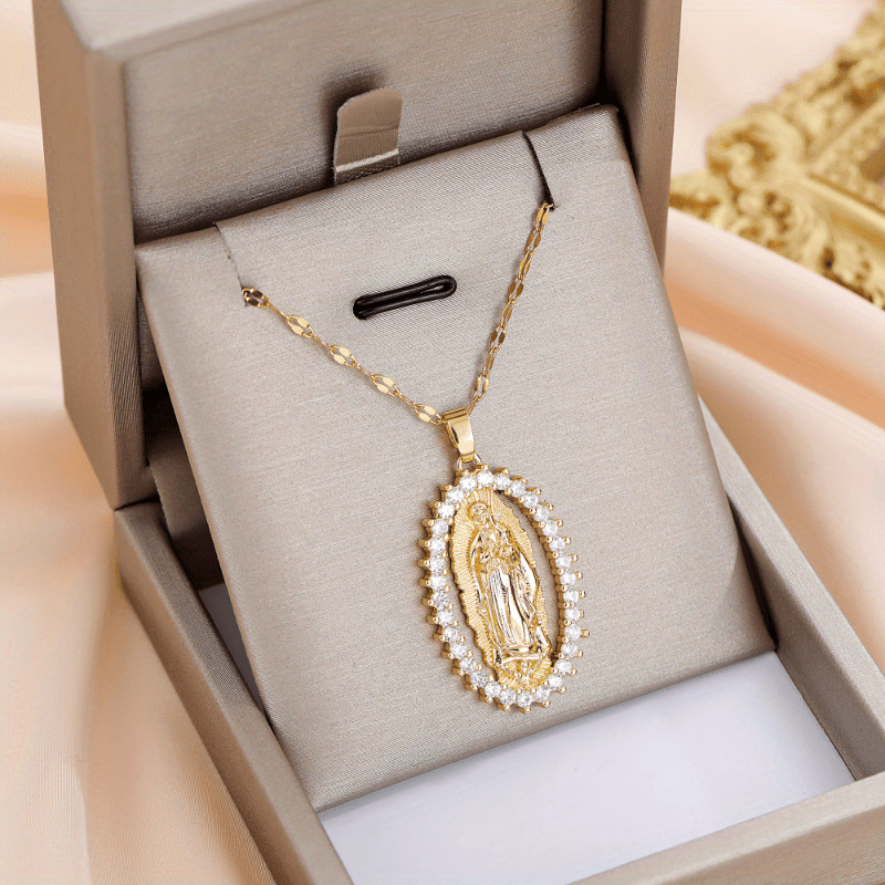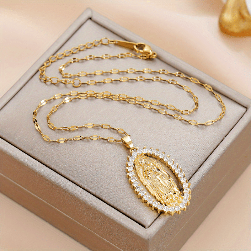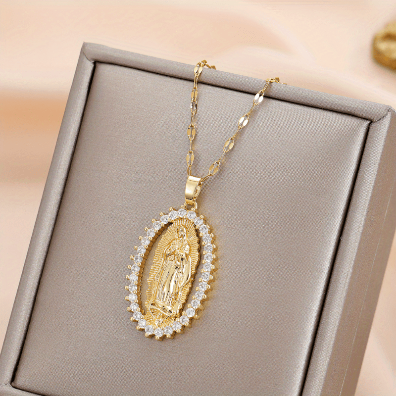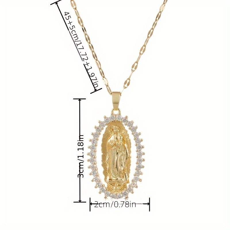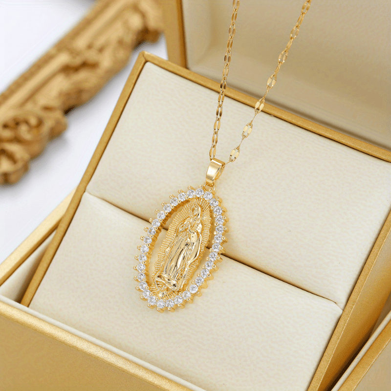 Elegant Golden Virgin Mary Geometric Pendant Necklace - a stylish spiritual accessory with a sparkling jewel aura, perfect for parties and events