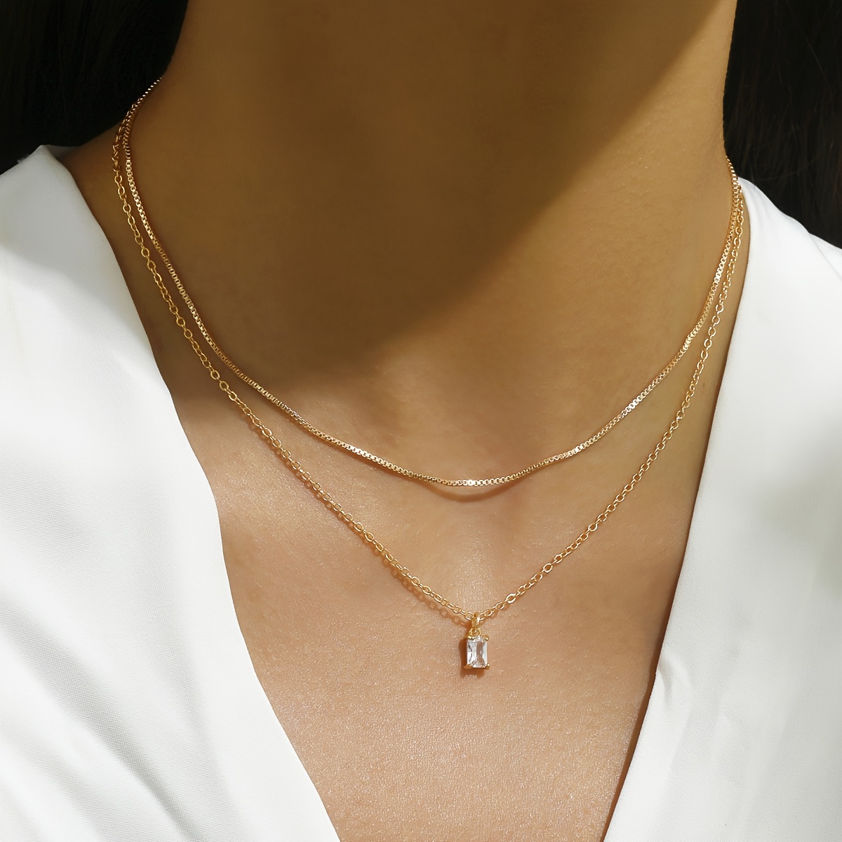 Elegant Square Zirconia Pendant Double Necklace Women's Daily Date Jewelry