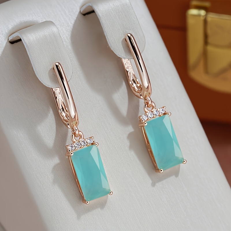[Elegant Style] Elegant Teal Zirconia Geometric Pendant Earrings - Ladies Gold Fashion Jewelry, Suitable for Weddings and Parties, with Sparkling Square Crystal Zircon Embellishment, Stylish Earrings