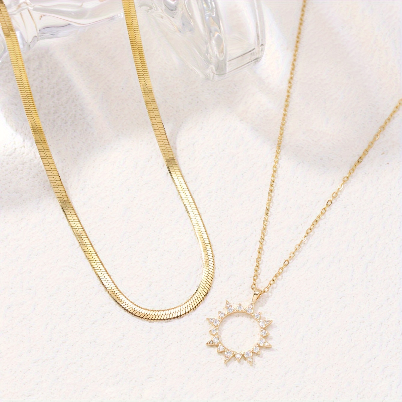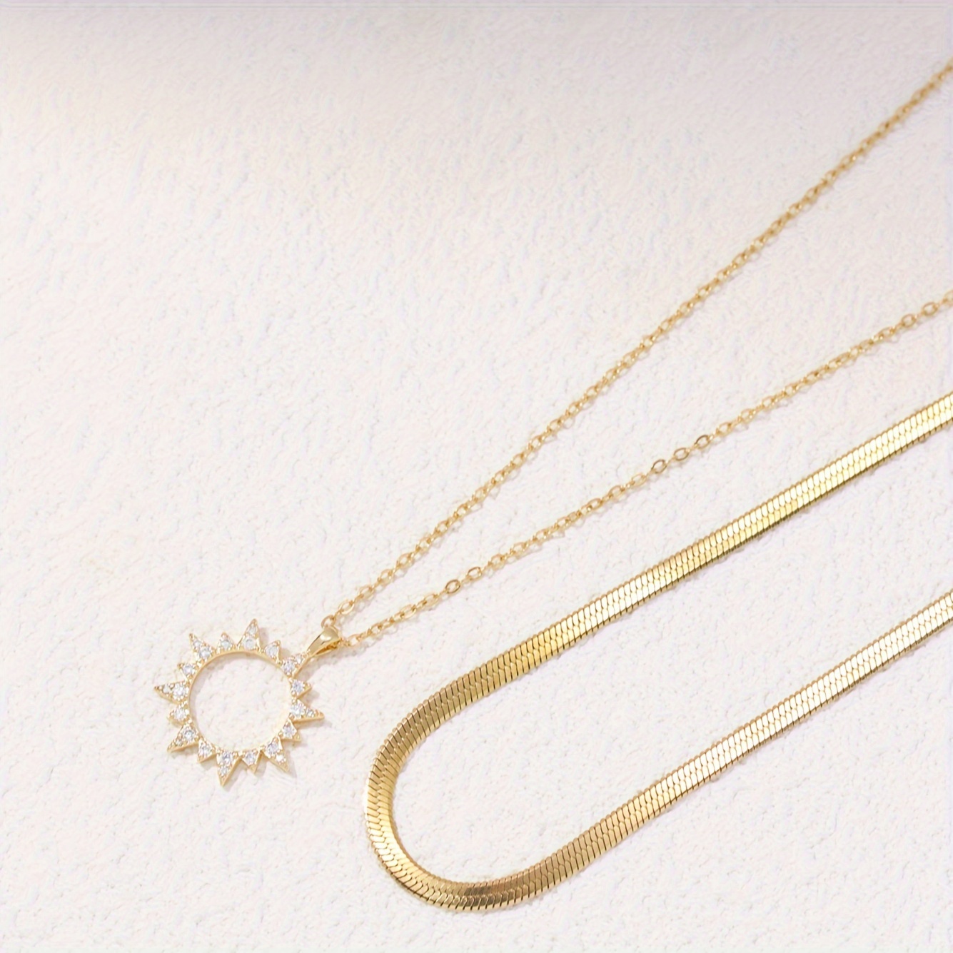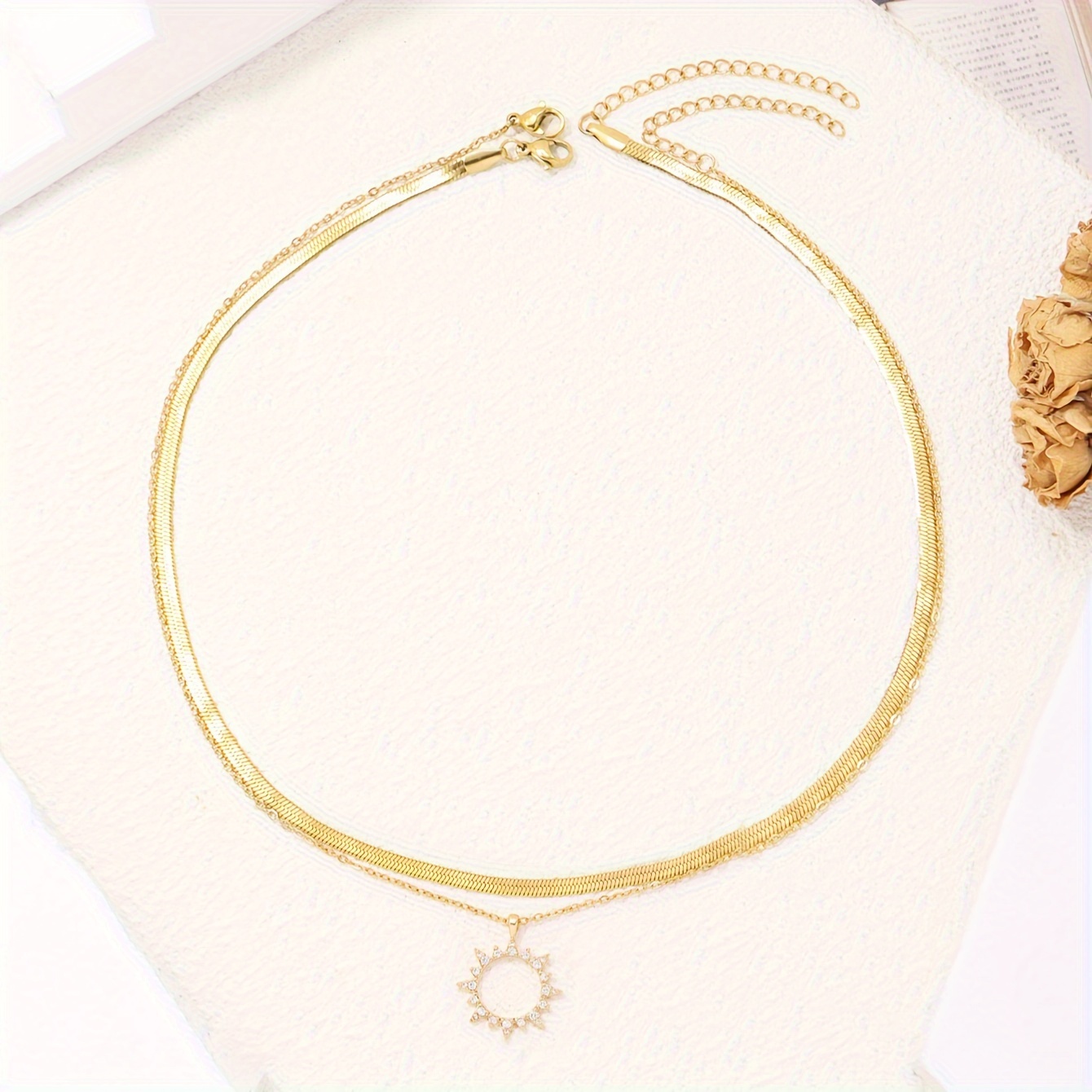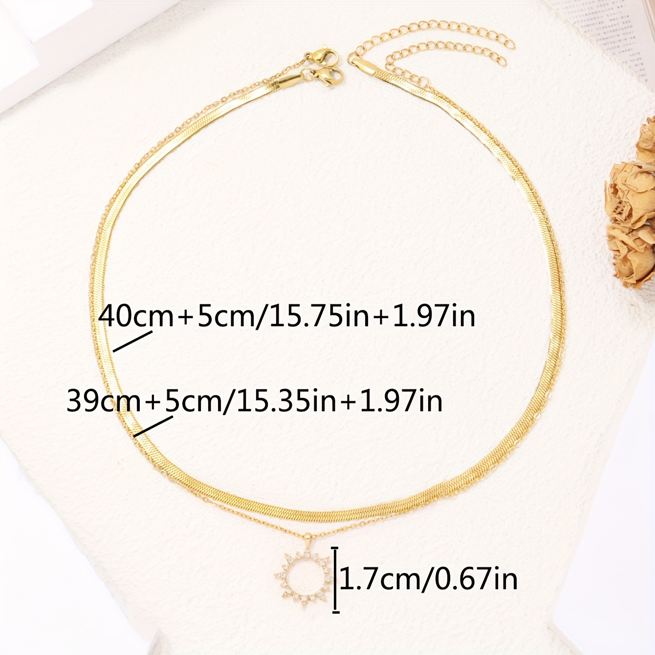 Elegant style zircon sun pendant necklace, stainless steel flat snake chain, double necklace, women's holiday daily jewelry gift