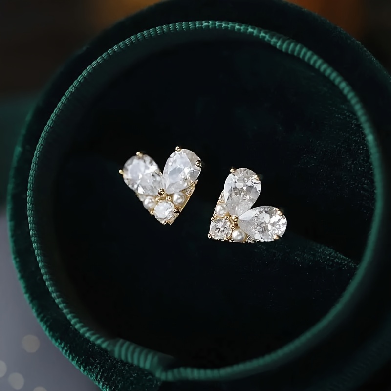 Exquisite heart-shaped design stud earrings, copper jewelry, zircon setting, elegant luxury style, women's date earrings.