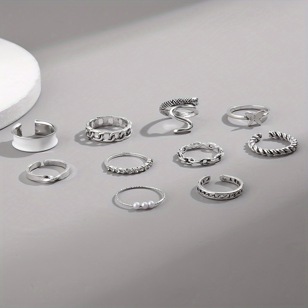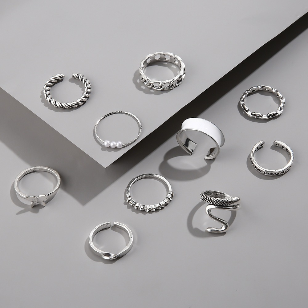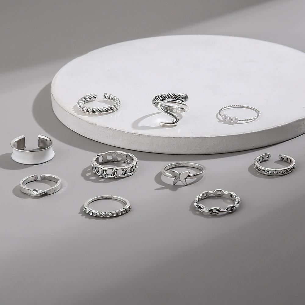 Fashion drop oil open snake ring personalized twist chain pearl combination 10-piece set