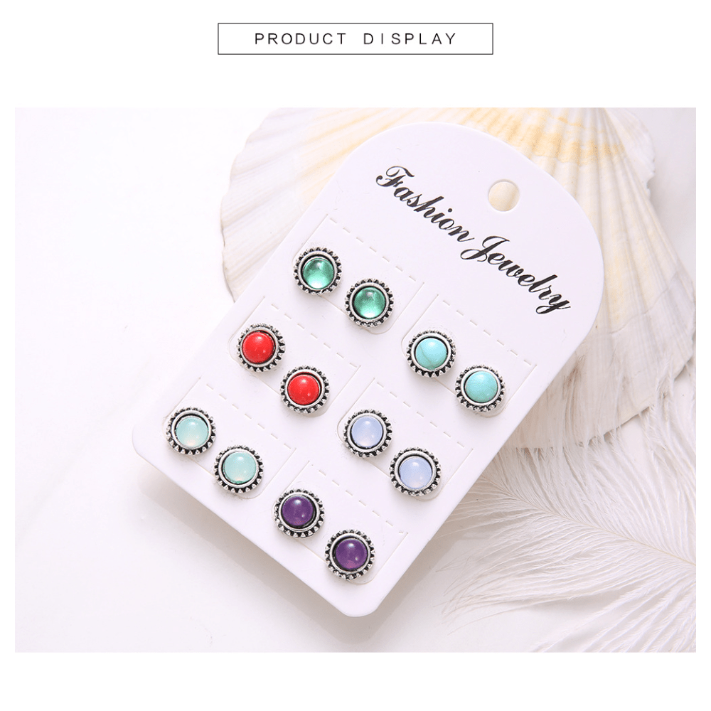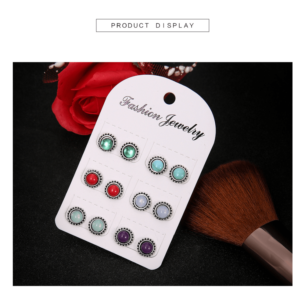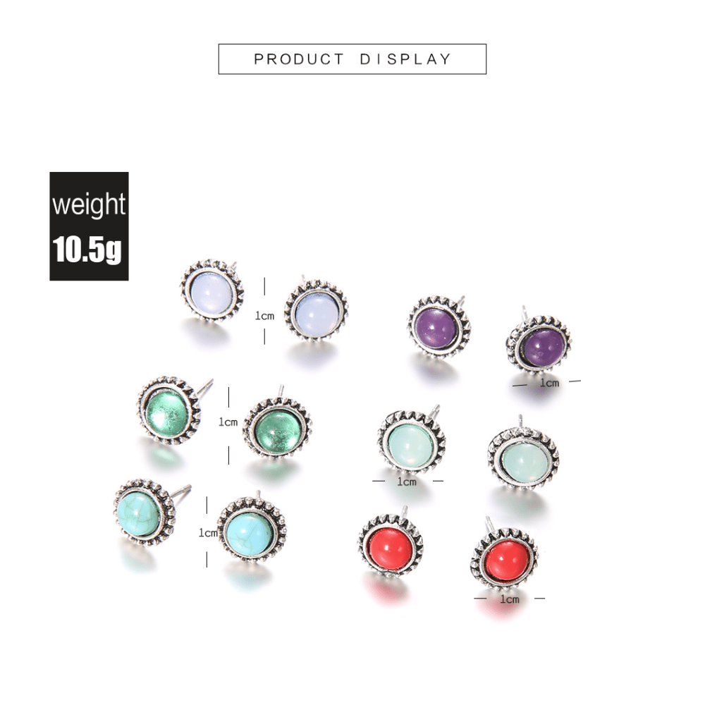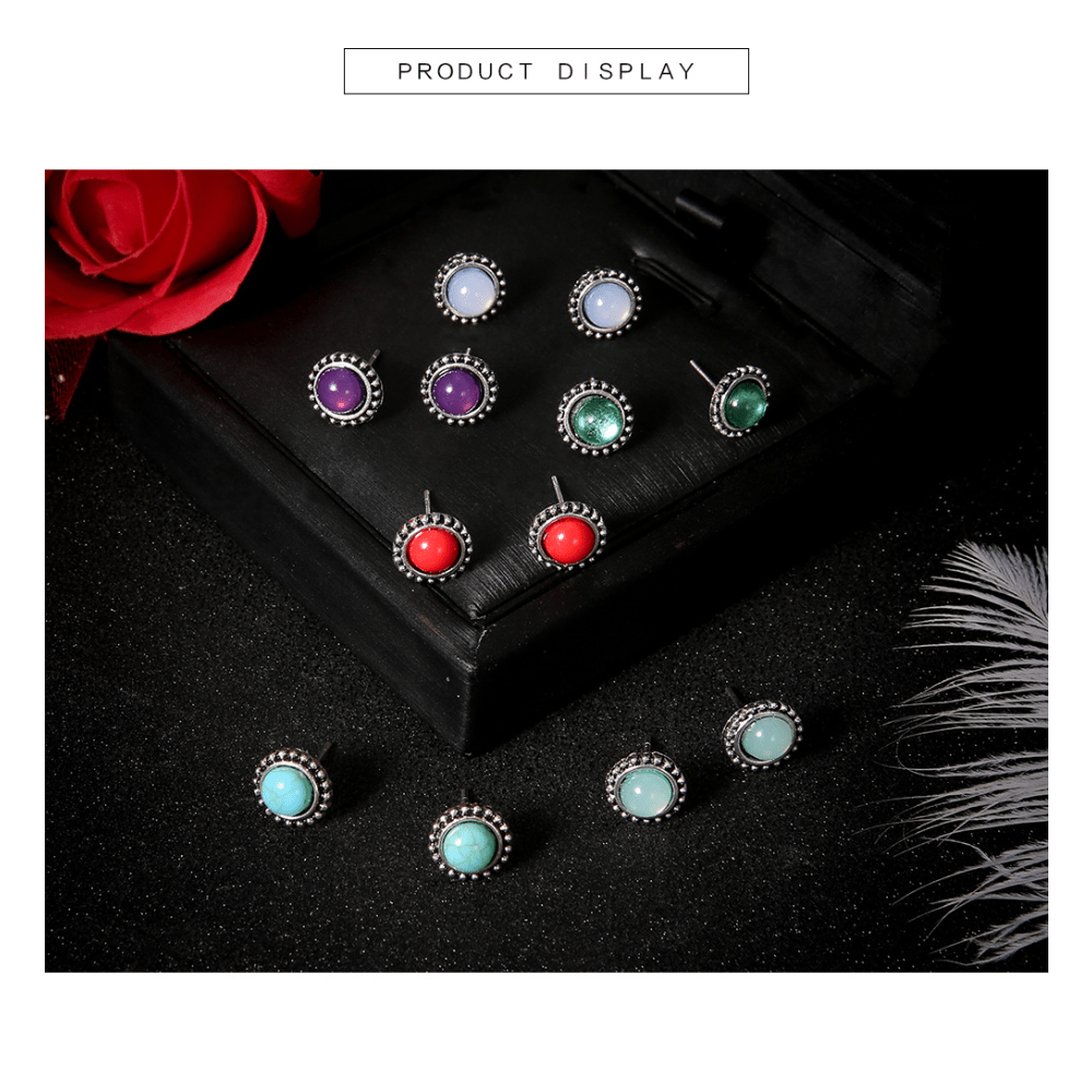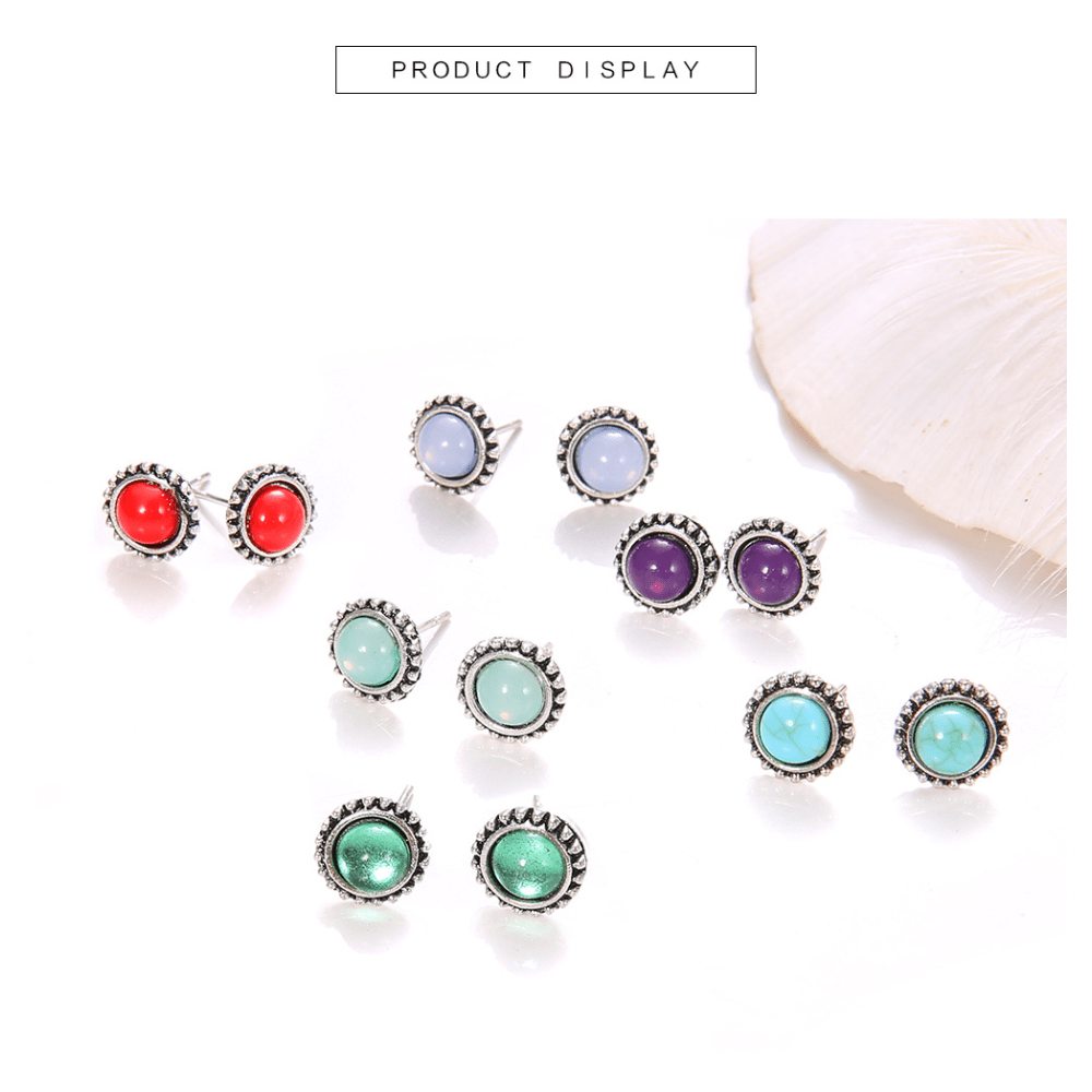Fashion Round Retro Gemstone Stud Earrings Harajuku Multi-color 6 Pairs of Stud Earrings