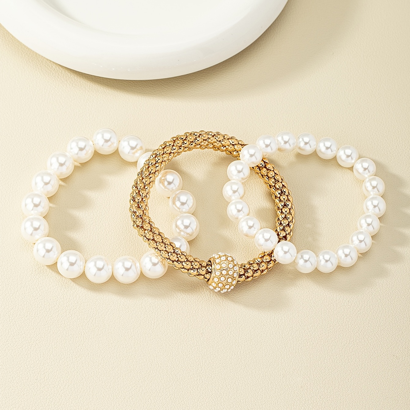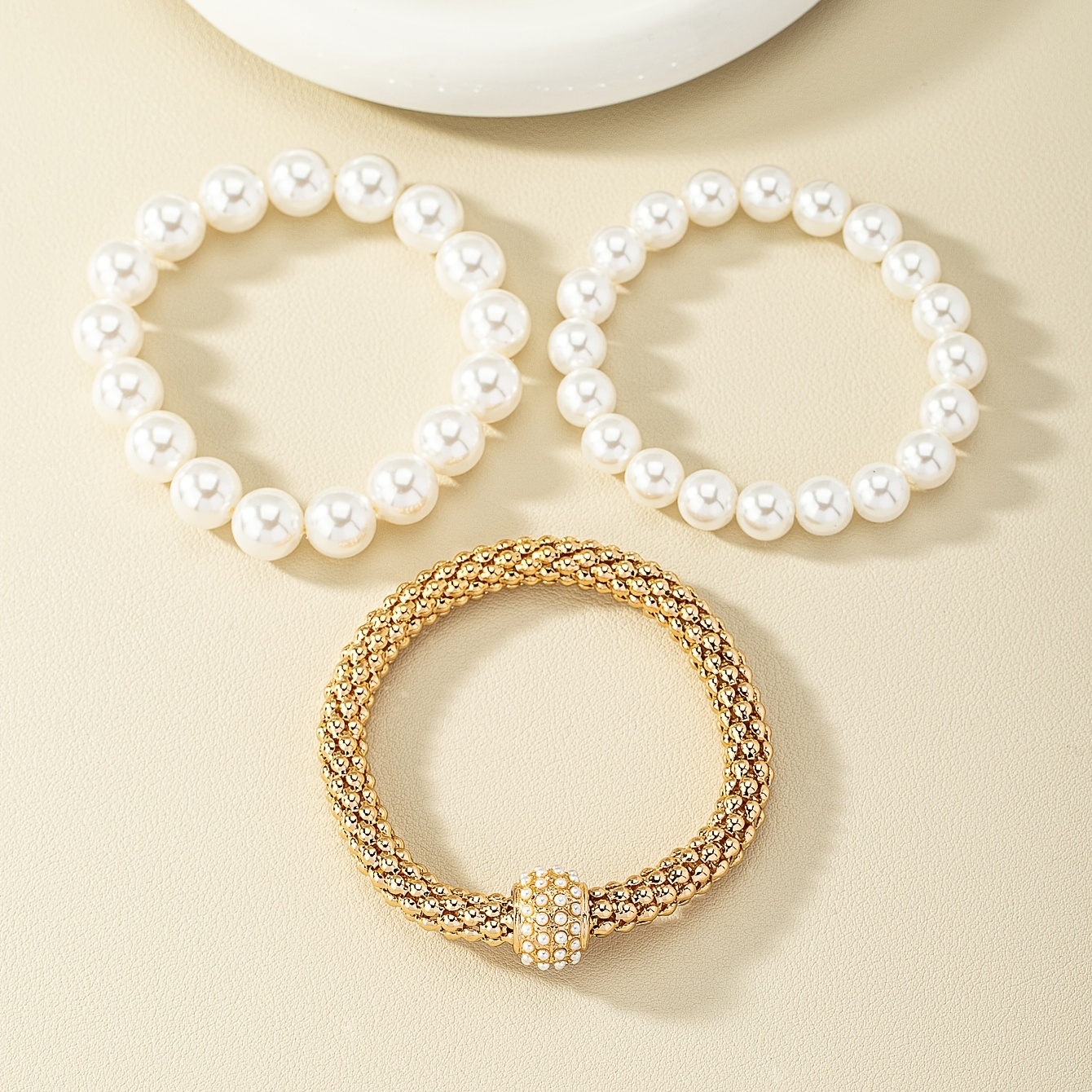 Faux Pearls Bracelet Kit 14K Gold Plated Stretch Hand Jewelry Set For Women & Girls 3 Pcs