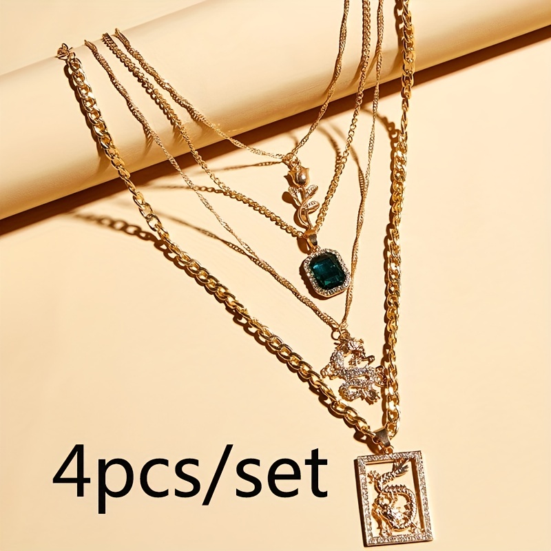 Four-piece creative rhinestone Chinese dragon pendant necklace charm retro ladies daily holiday jewelry