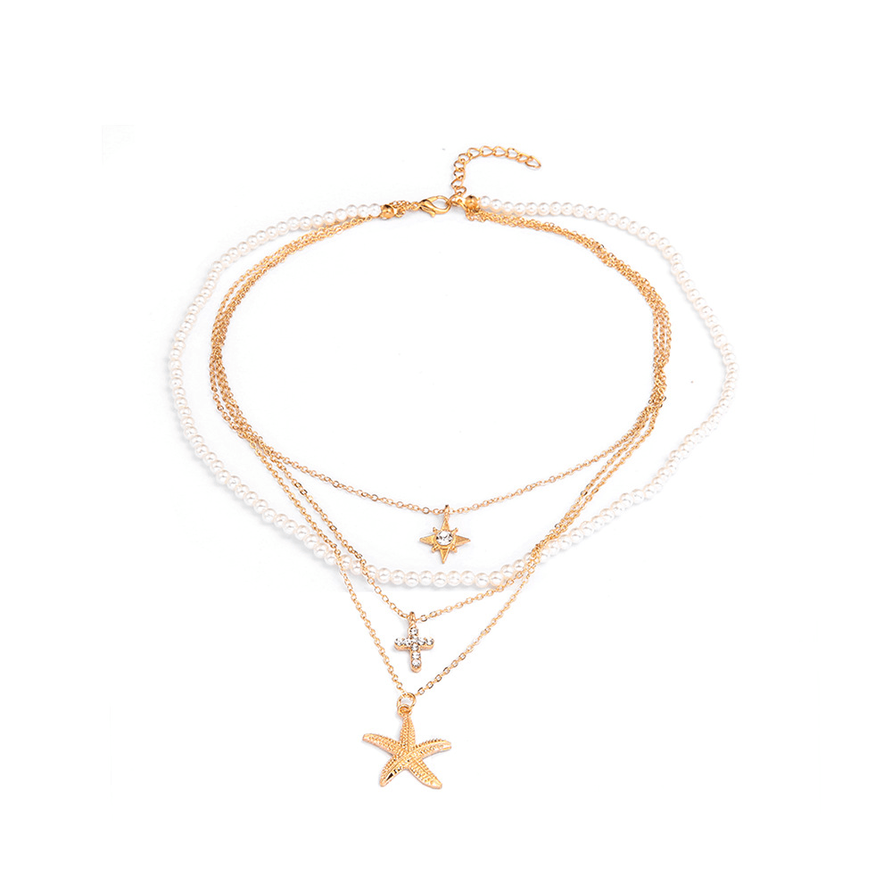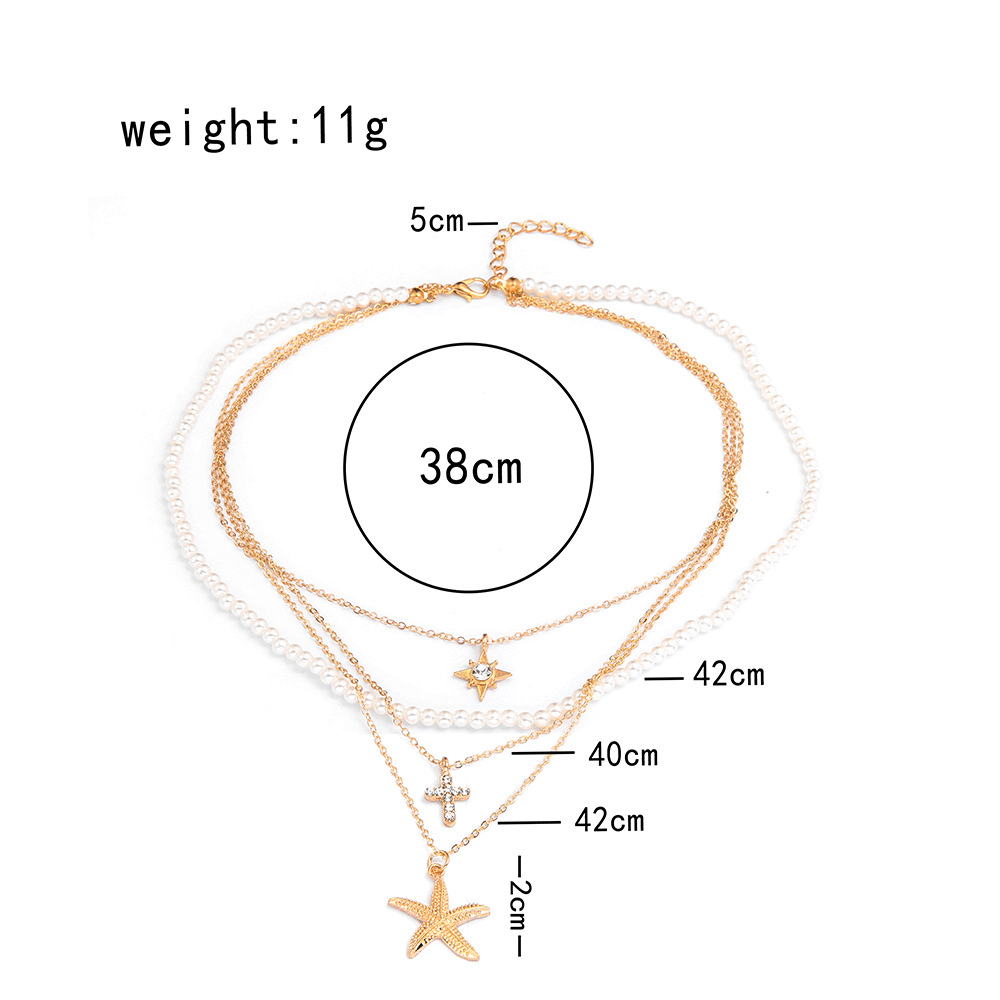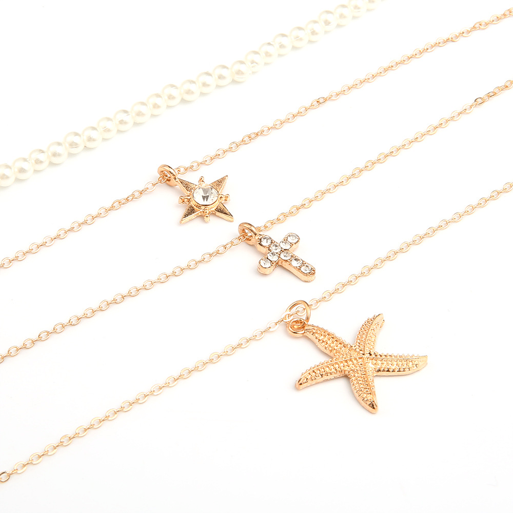 Harajuku Street Starfish Cross Pearl Sun Shaped Diamond Pendant Necklace Vintage 4-layer Necklace