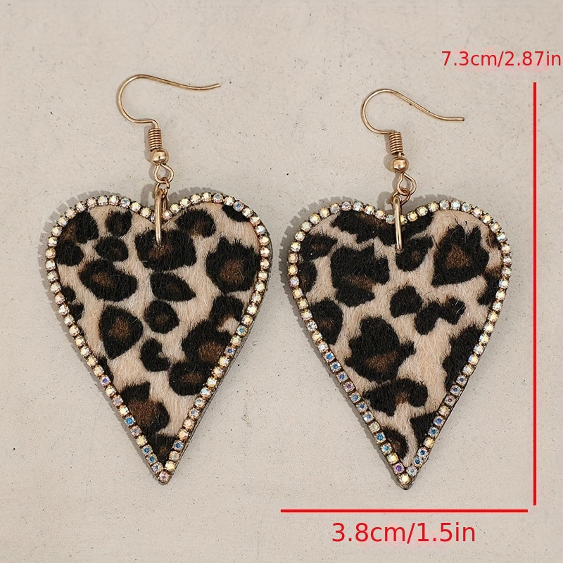 Heart-shaped flocked leopard print shiny Zirconia decorative pendant earrings, simple and sexy style, western festival earrings
