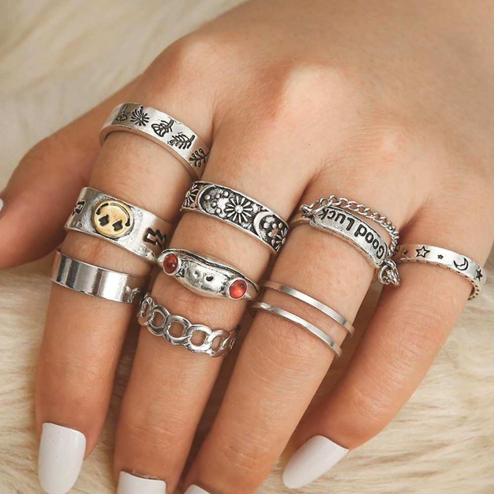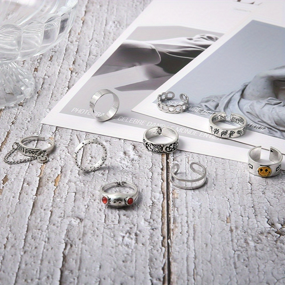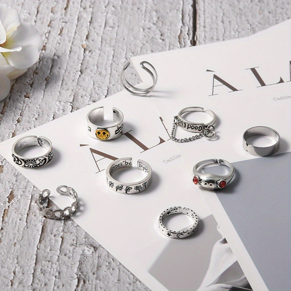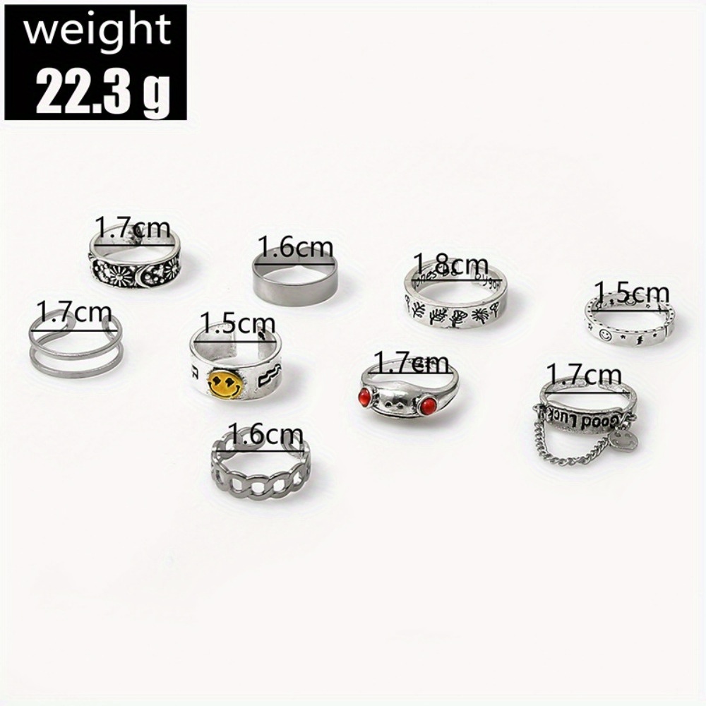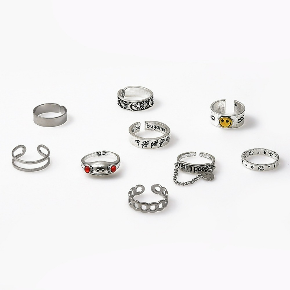 Hip-hop punk style English good luck frog smiley face opening 9-piece ring woman