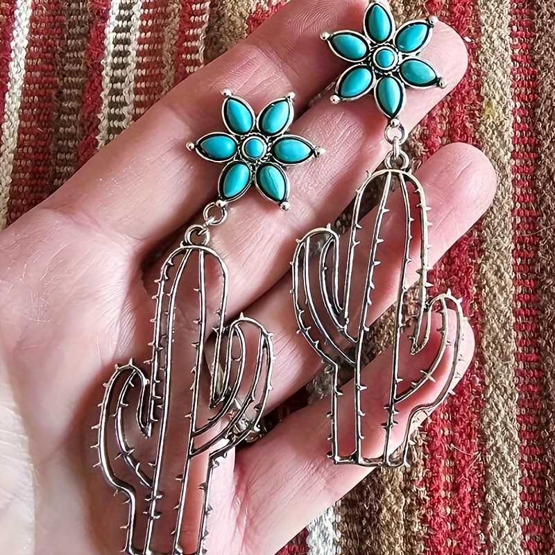 Hollow Cactus Flower Design Turquoise Inlaid Drop Earrings Vintage Western Silver Plated Jewelry Holiday Earrings