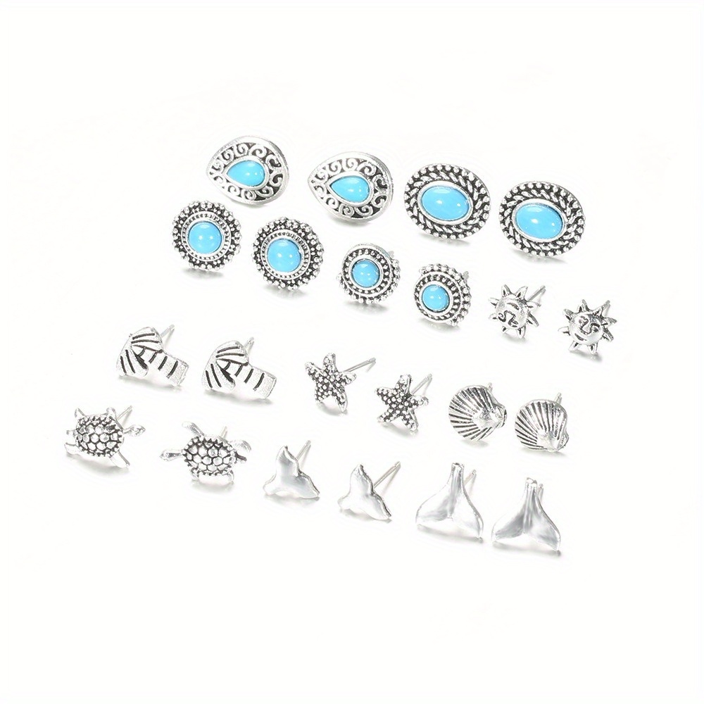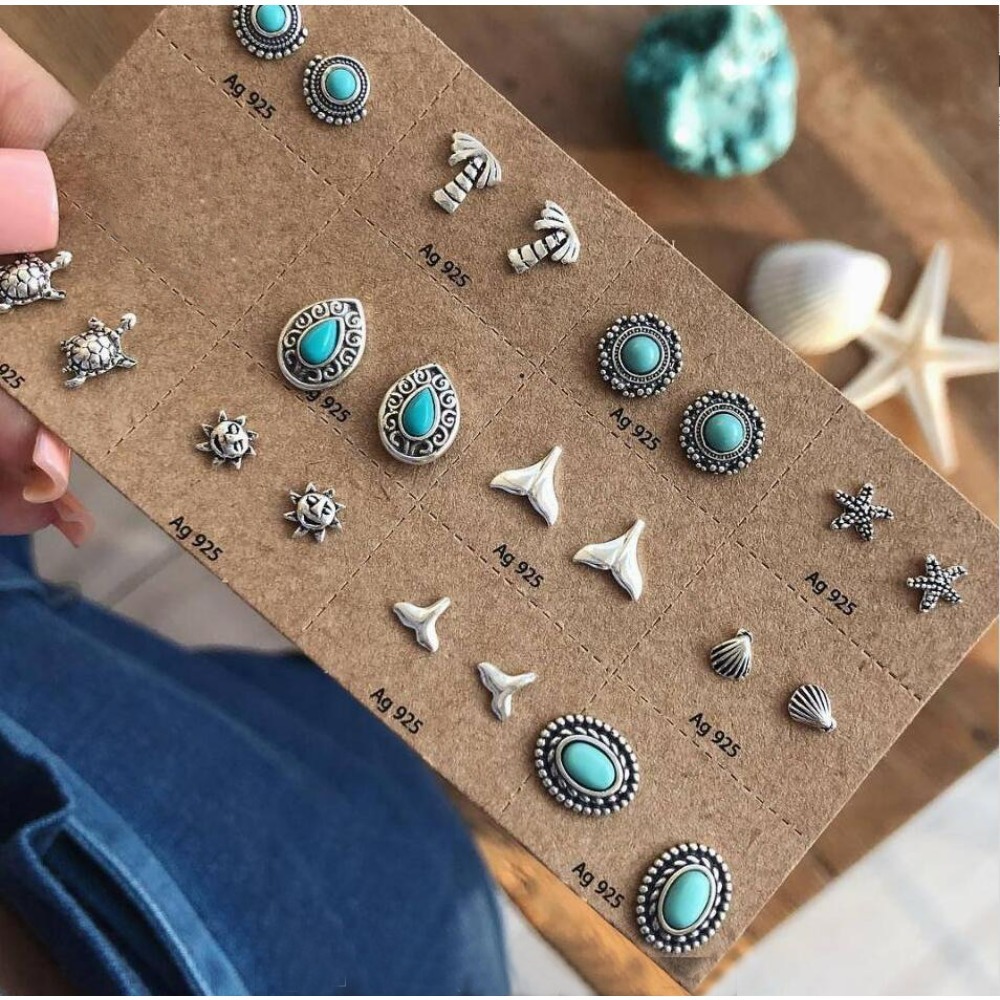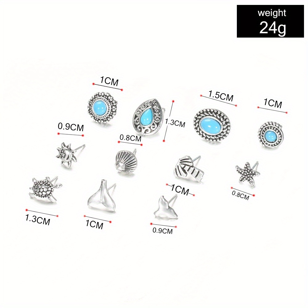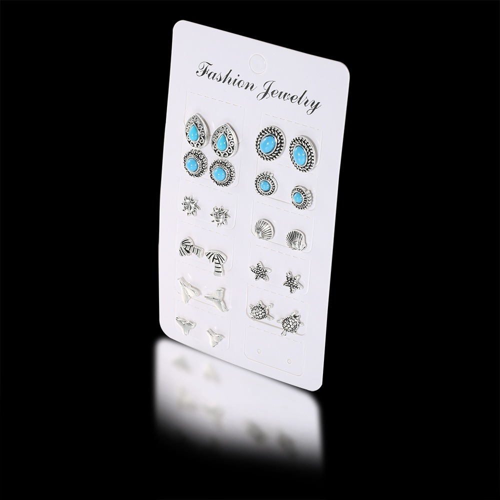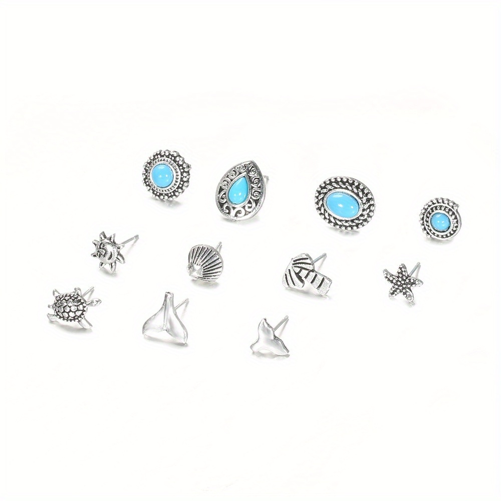 Hollow Carving Turquoise Starfish Sea Turtle Fish Tail 11-piece Combination Set Earrings