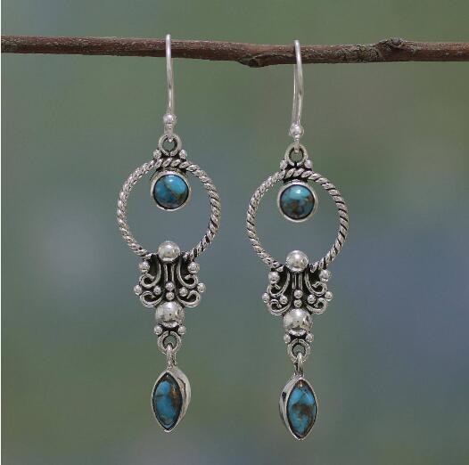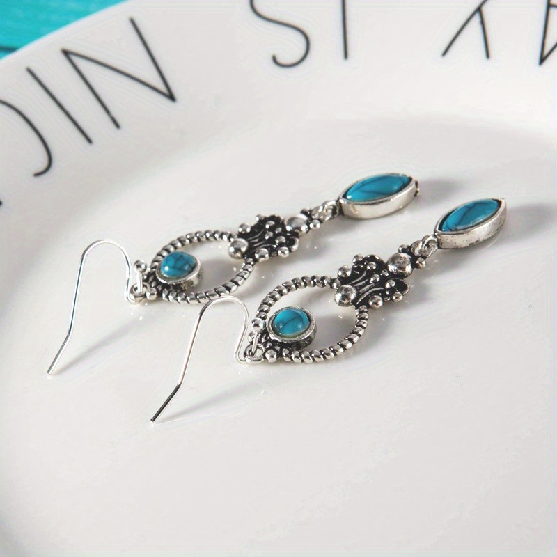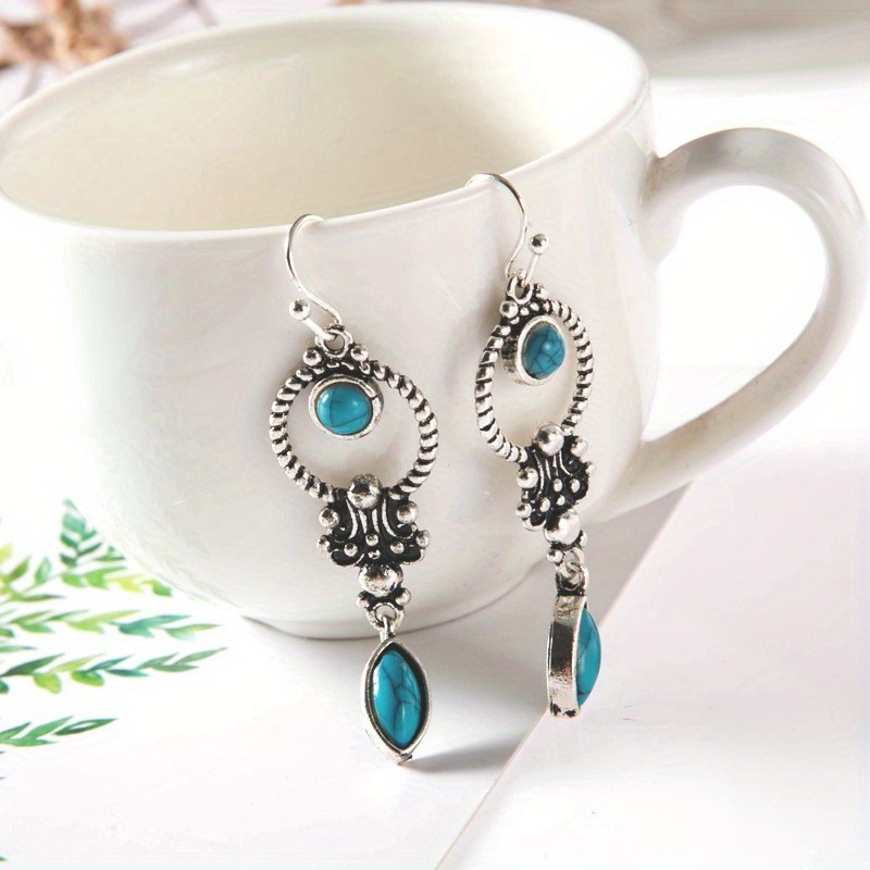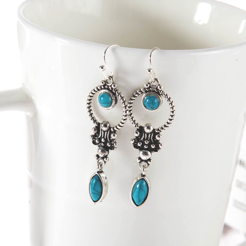Hollow silver circle design with blue turquoise drop earrings retro bohemian travel souvenir