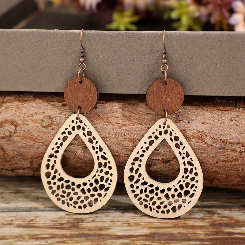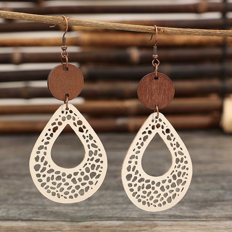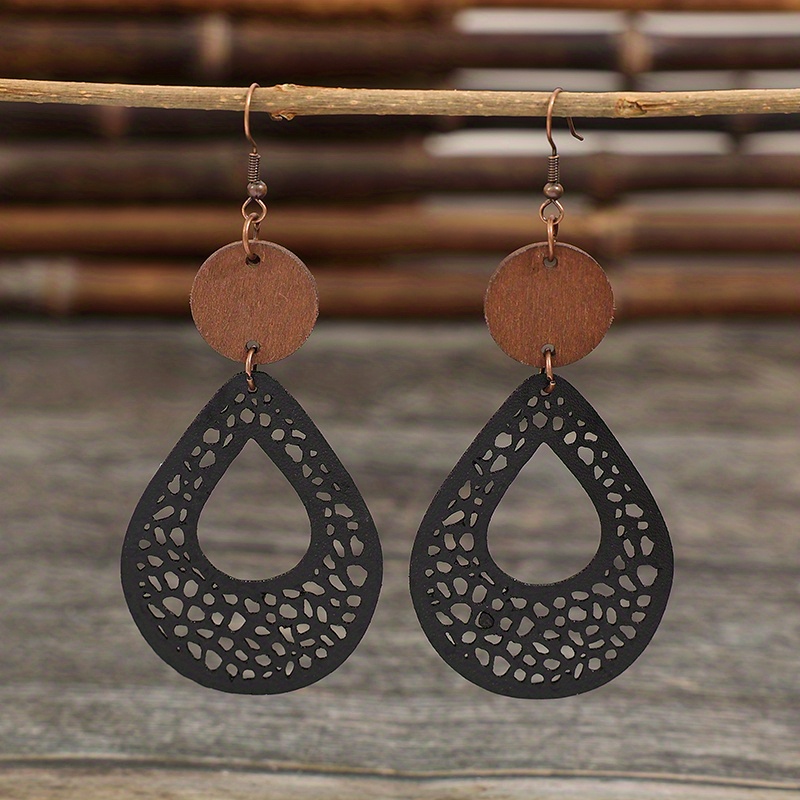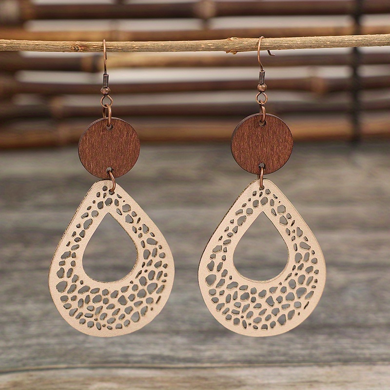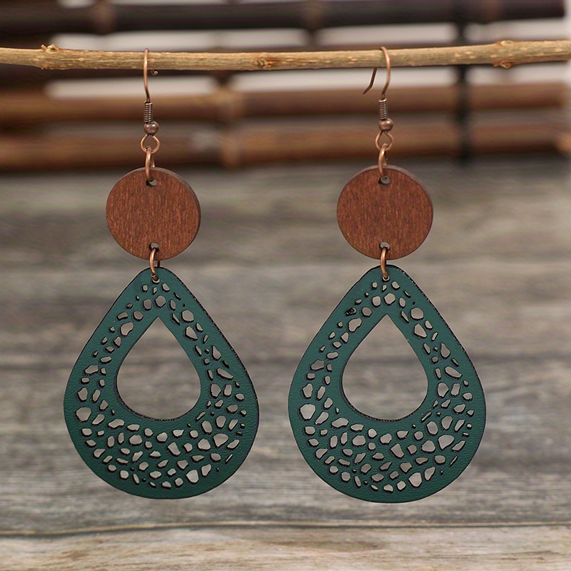 Hollow teardrop-shaped engraved pattern drop earrings retro bohemian style PU leather jewelry fashion women's gift