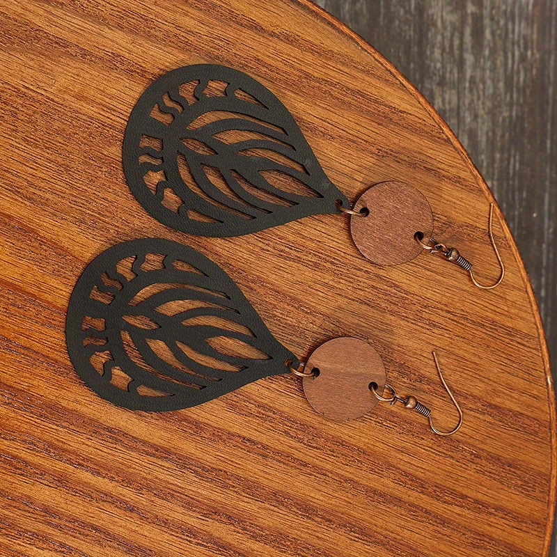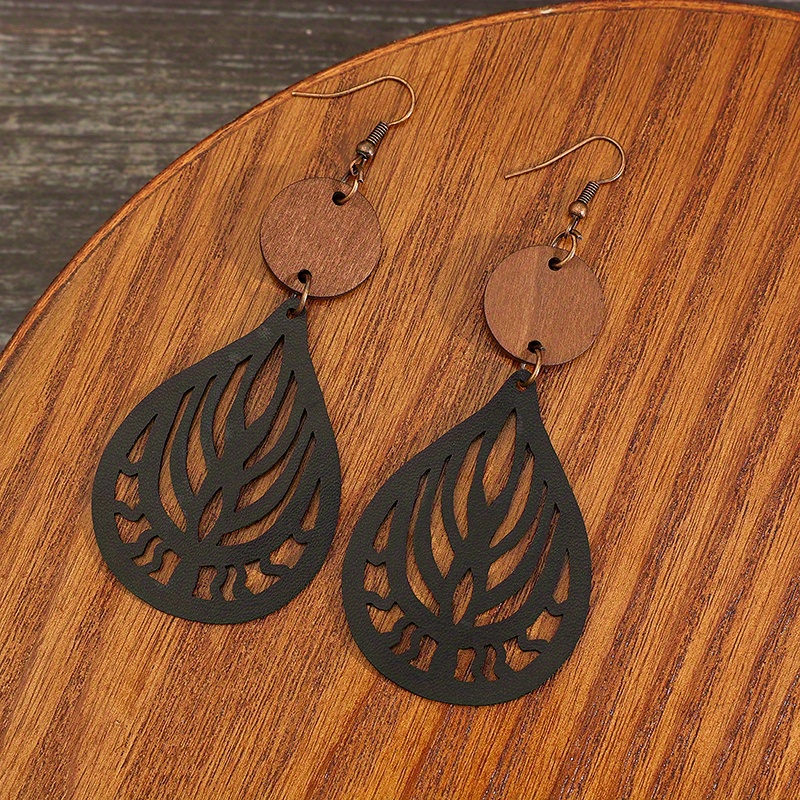 Hollow teardrop-shaped engraved pattern drop earrings retro bohemian style PU leather jewelry fashion women's gift