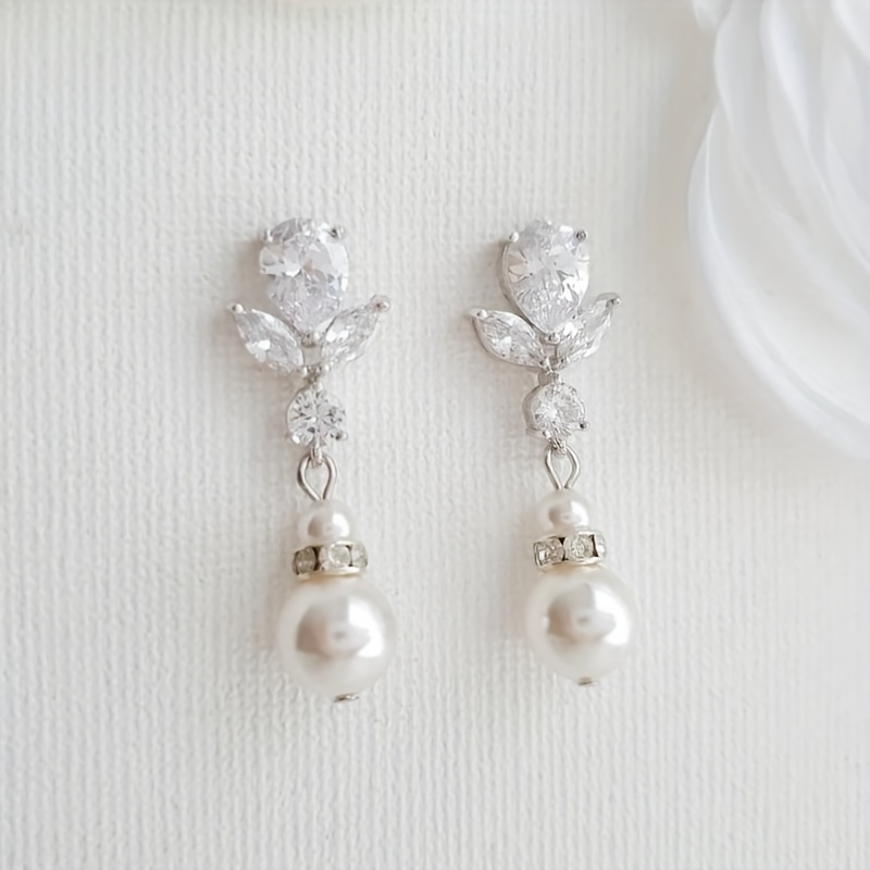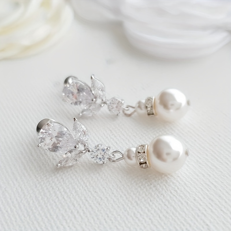 Imitation pearl pendant, shiny zircon inlaid earrings, elegant simple style, exquisite wedding earrings.