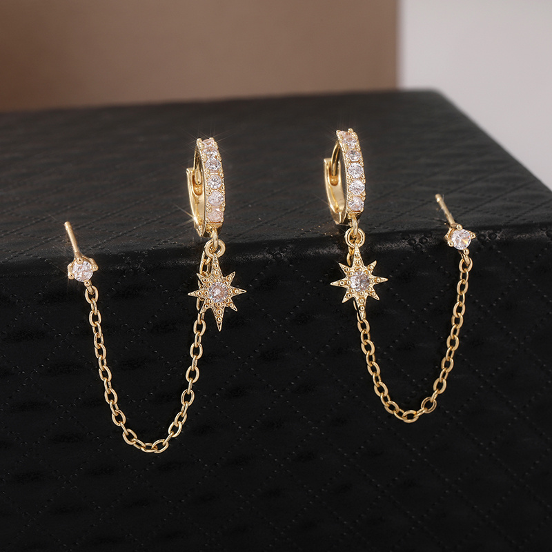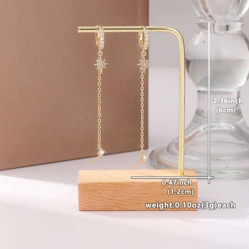Ladies Bohemian style 14K gold-plated chain earrings, double-pierced pendant earrings with cubic Zirconia studs, vintage fashion earrings, all-season gift ideas