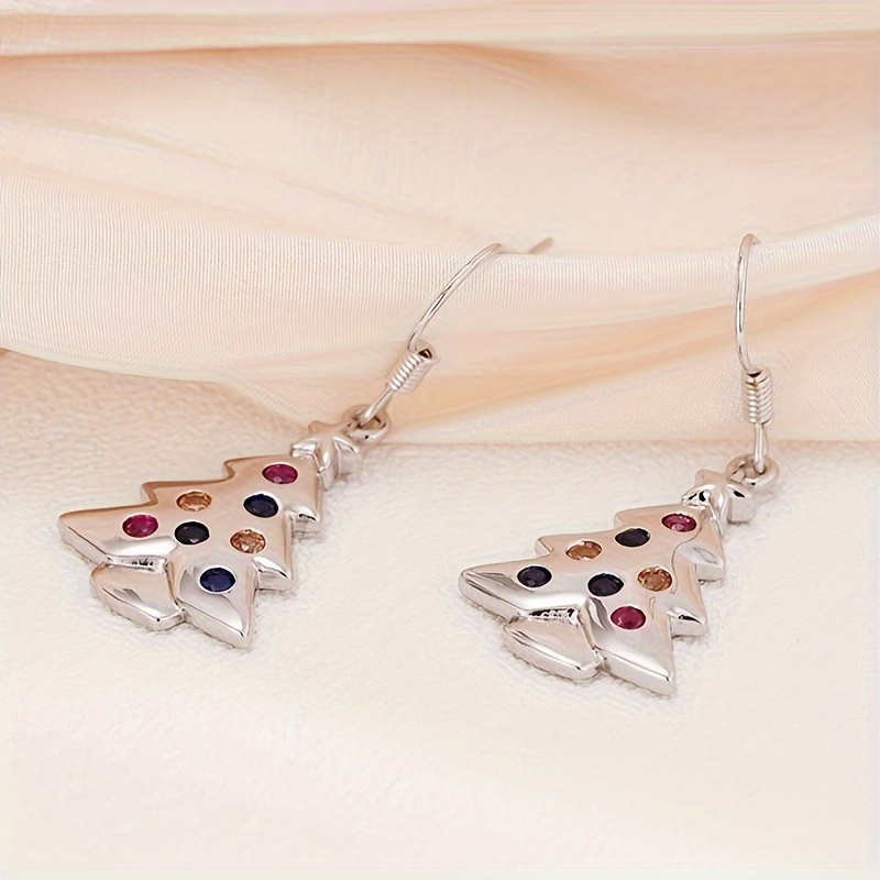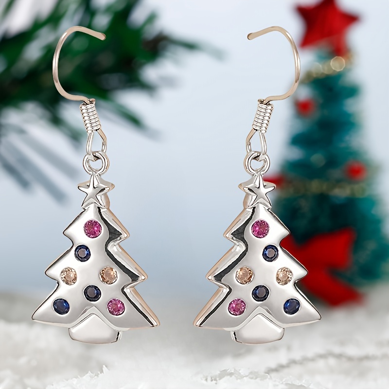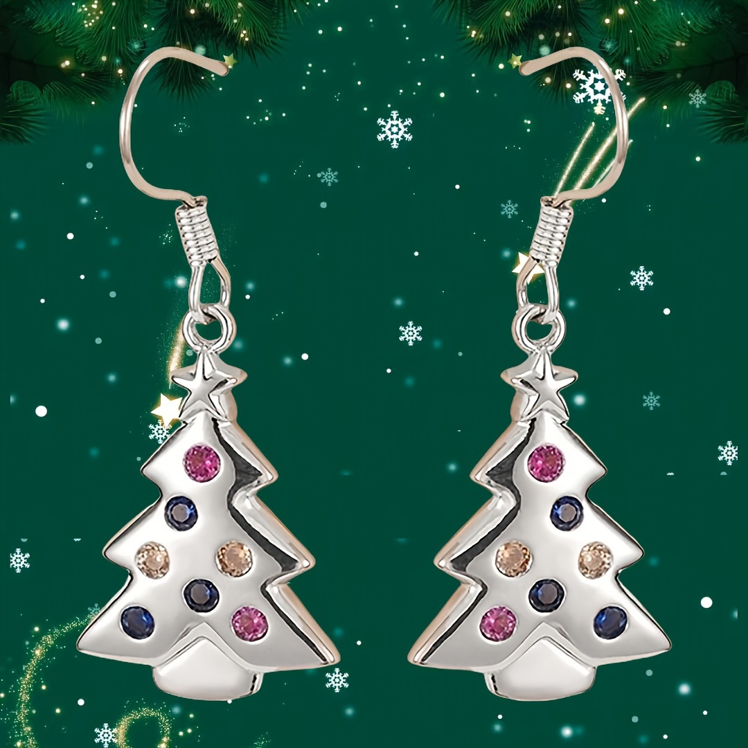 Ladies Elegant Christmas Tree Pendant Earrings, Colored Synthetic Cubic Zirconia, Lovely Holiday Themed Copper Hook Earrings, Nickel Plated Lead Free, Perfect for Everyday and Party Occasions - 1 Pair