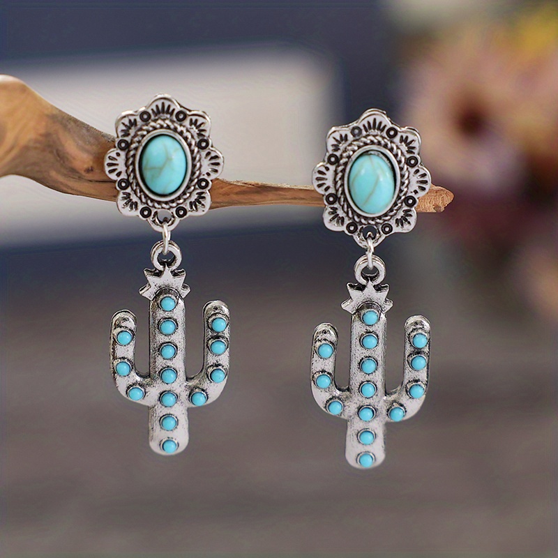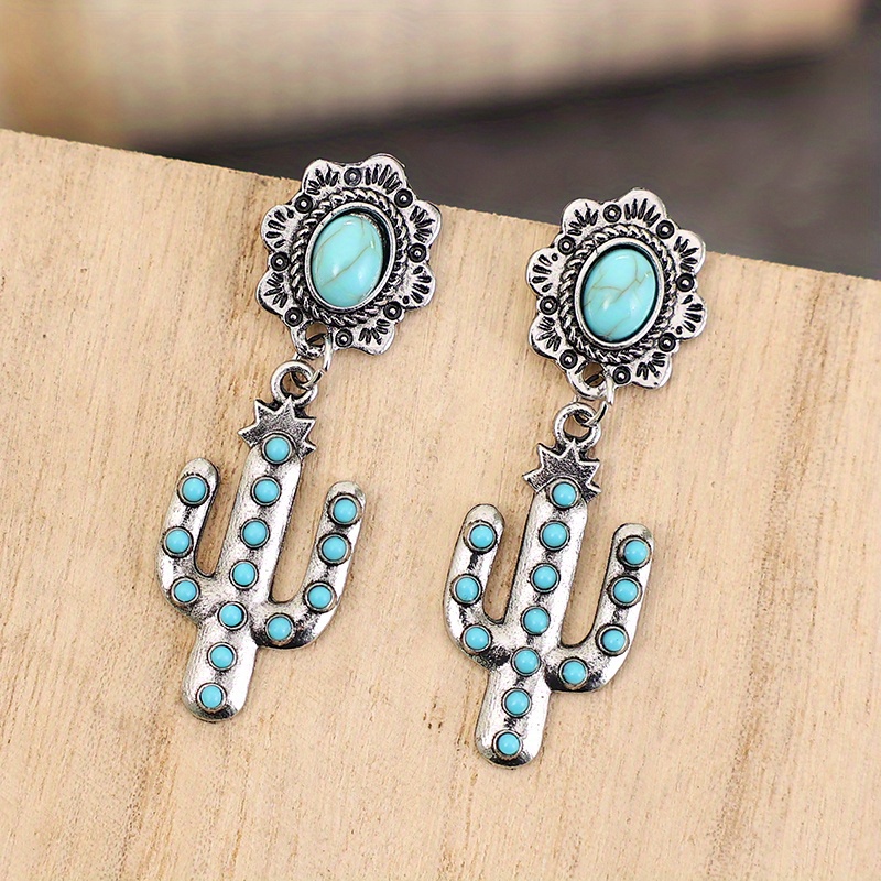 Ladies Fancy Cactus Design Antique Copper Turquoise Earrings Western Exaggerated Pendant Earrings